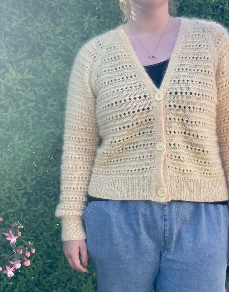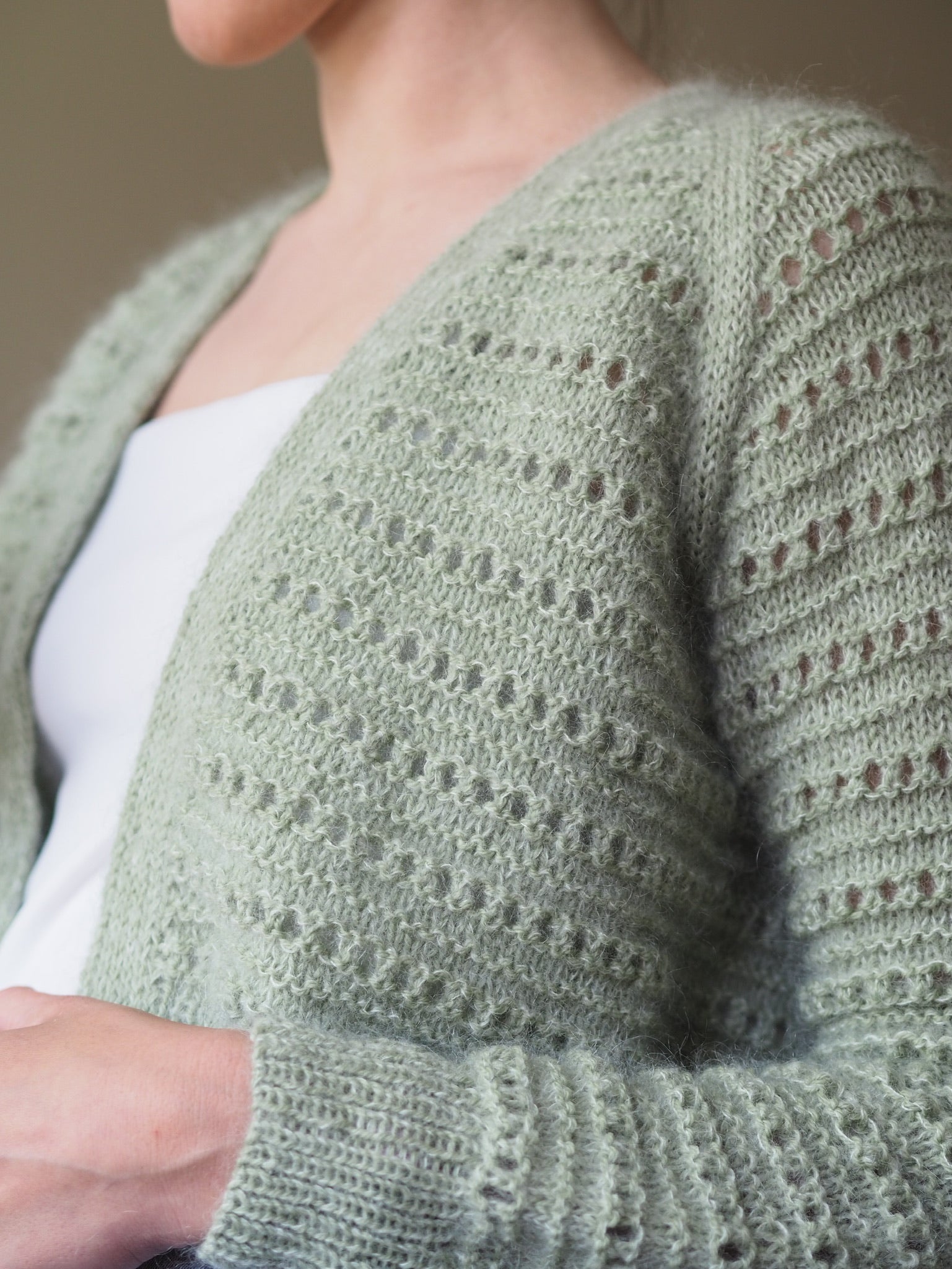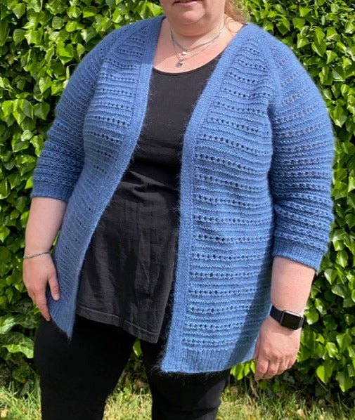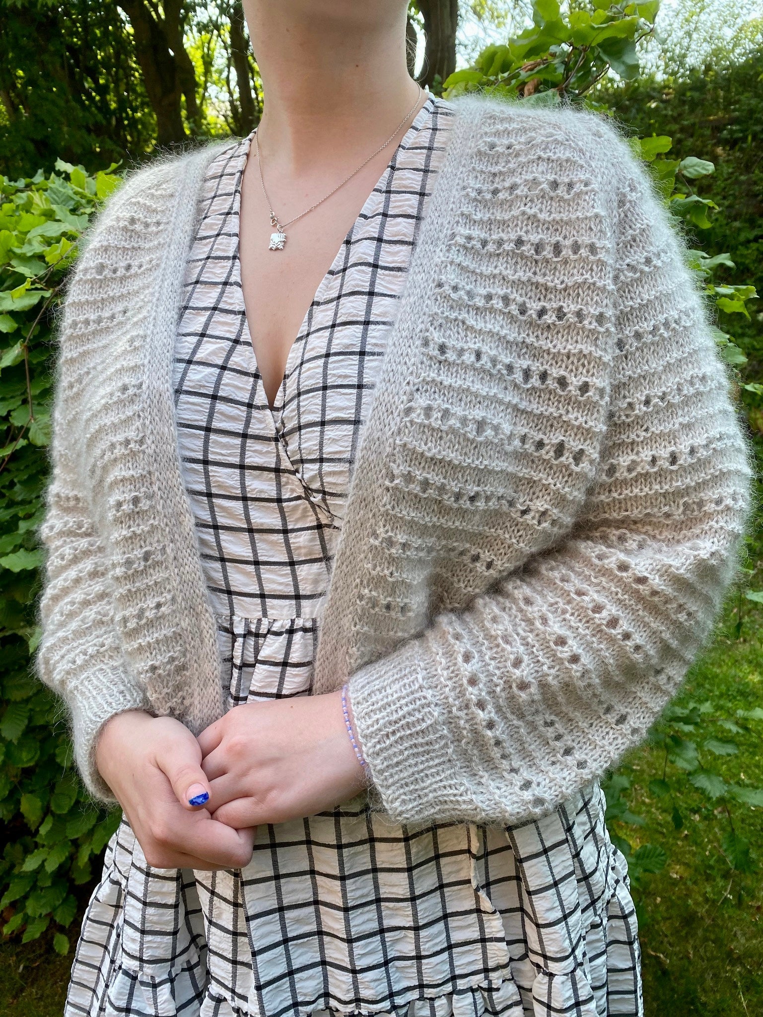 The Easy Spring Jacket is a great spring and summer jacket. It is super light and airy which makes it perfect for the warm weather. The jacket is made from the top down in a beautiful and feminine hole pattern with a double knitted button band, and wide raglan stitches.