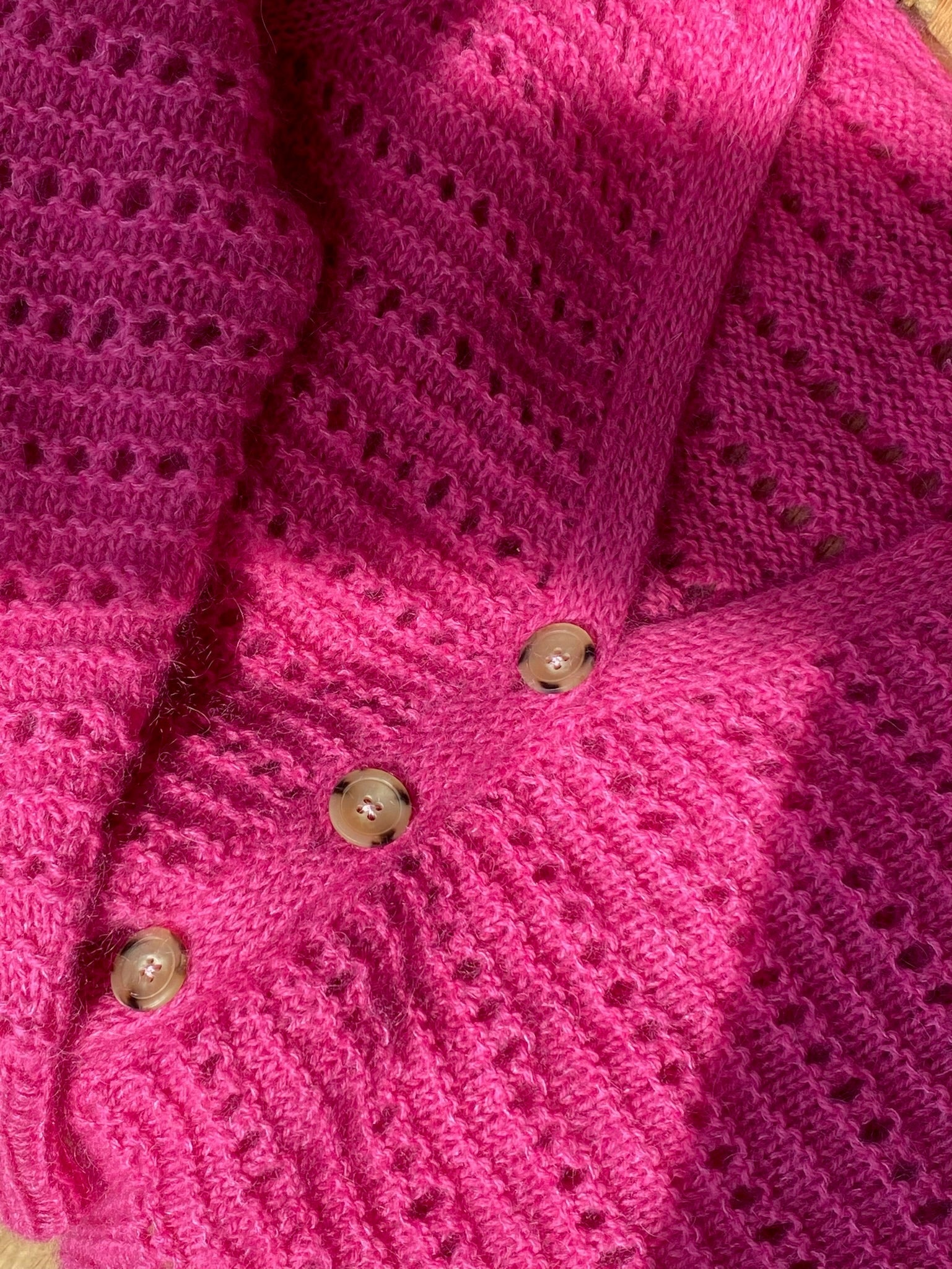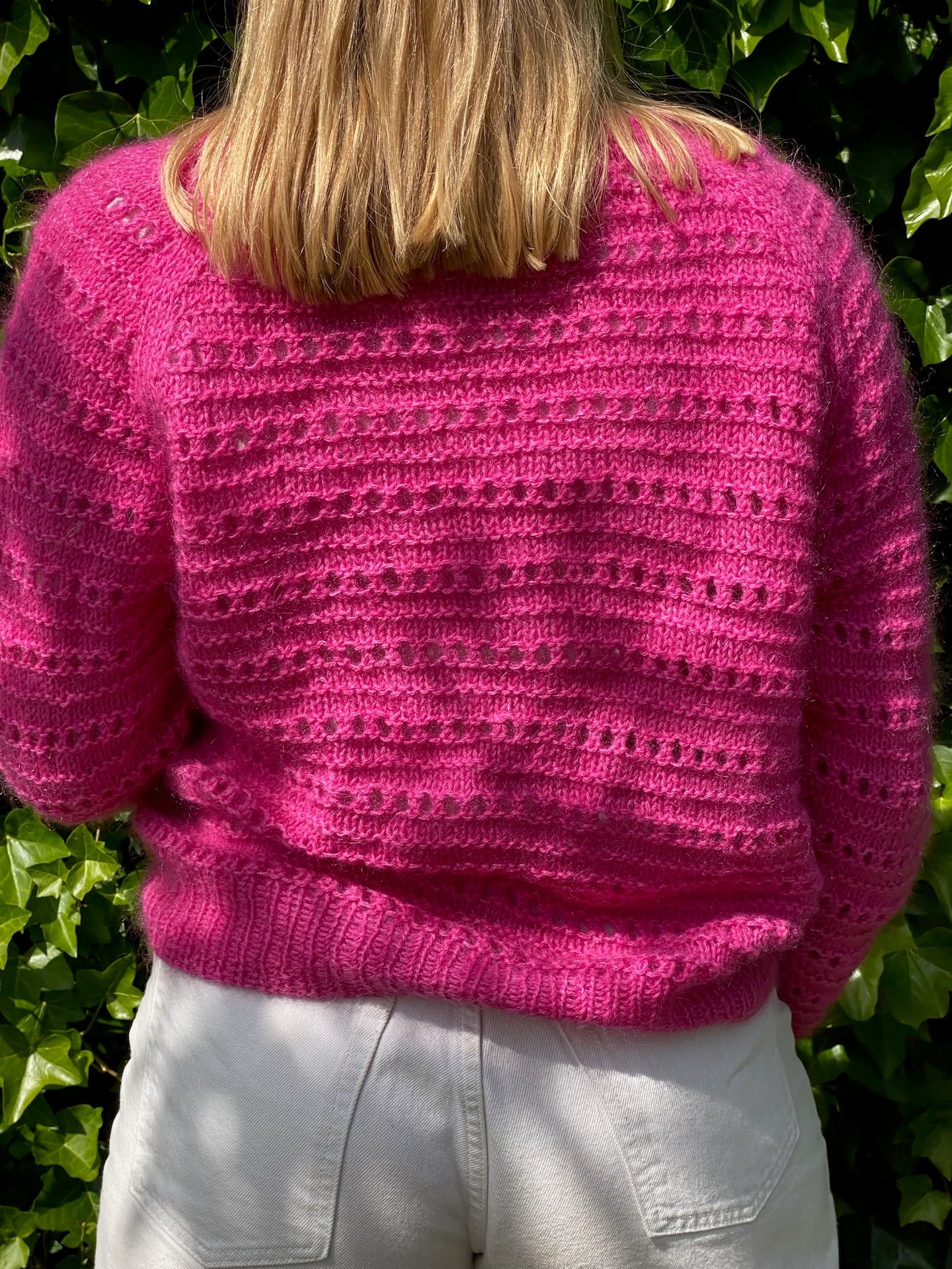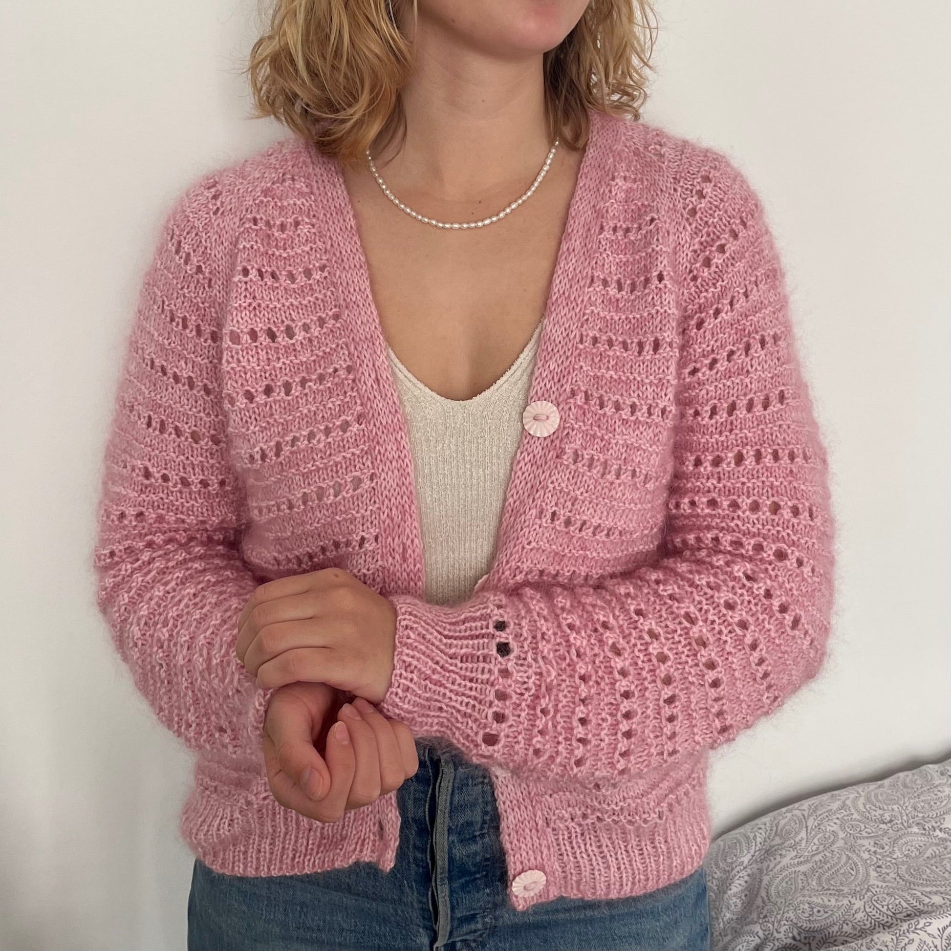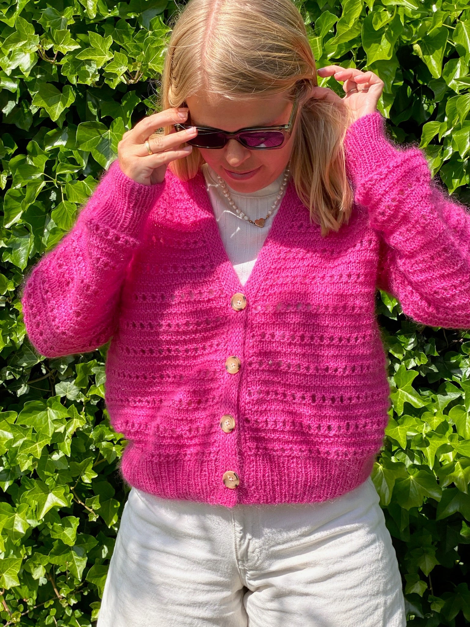 The Easy Spring Jacket is a great spring and summer jacket. It is super light and airy which makes it perfect for the warm weather. The jacket is made from the top down in a beautiful and feminine hole pattern with a double knitted button band, and wide raglan stitches.