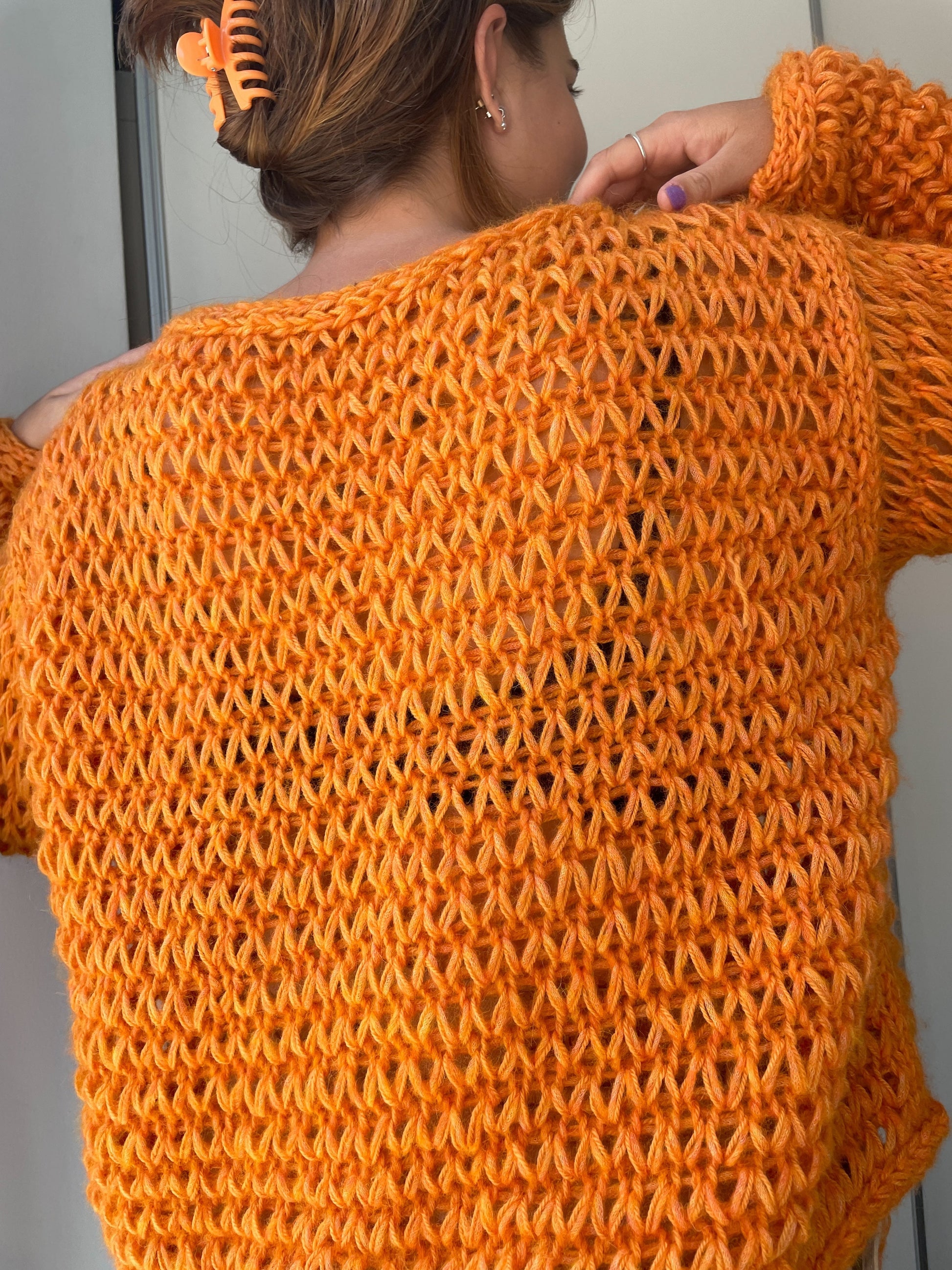 The Easy Breezy Sweater is a slightly oversized sweater made from the top down in a hole pattern. The hole pattern is made by creating “long stitches”. The sweater has a simple look with a boat neck and i-cord edges by the sleeves and at the bottom edge.