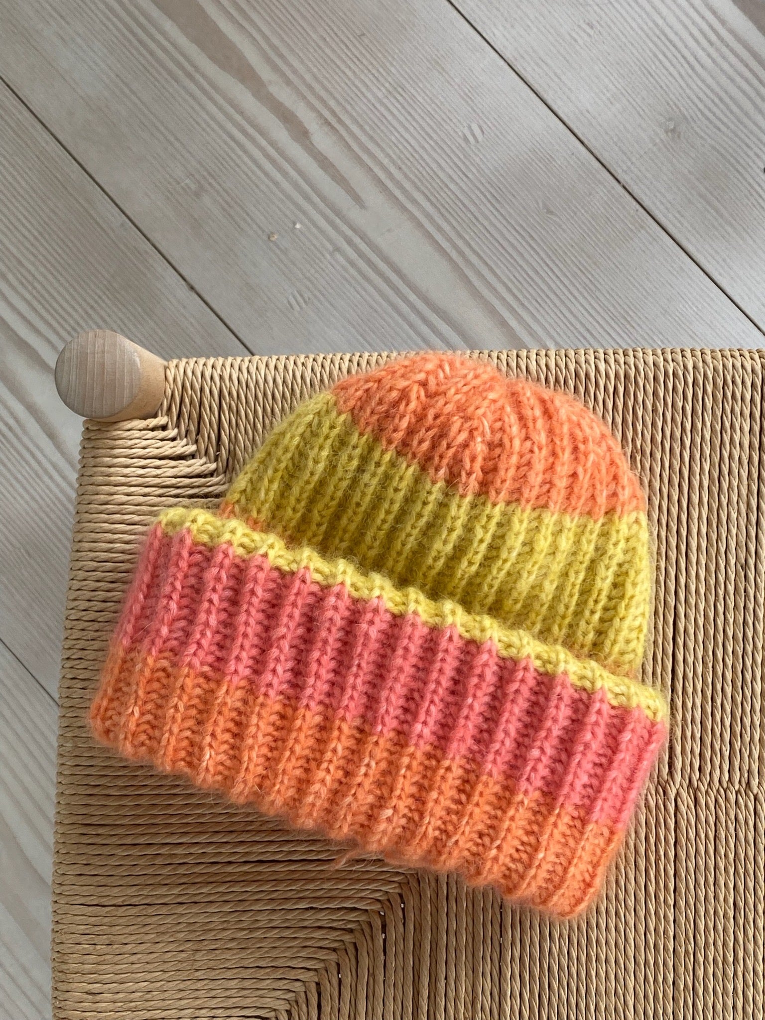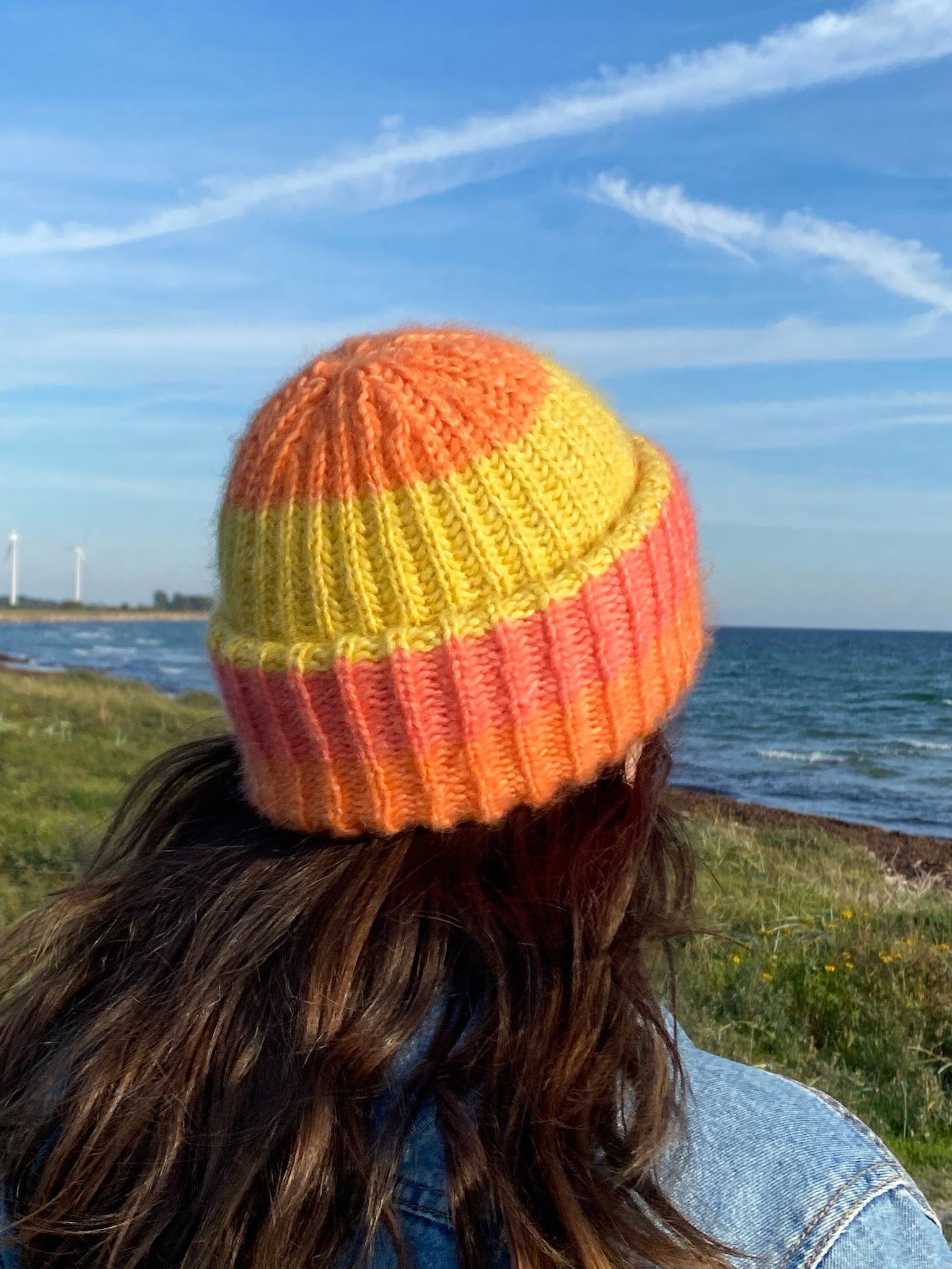 Easy Patent Beanie er en stribet hue, som er strikket i patent. Huen strikkes som et langt rør i farvede striber og med fine indtagninger i toppen. Huen ombukkes til sidst. Den store ombukkede kant varmer ørerne godt.