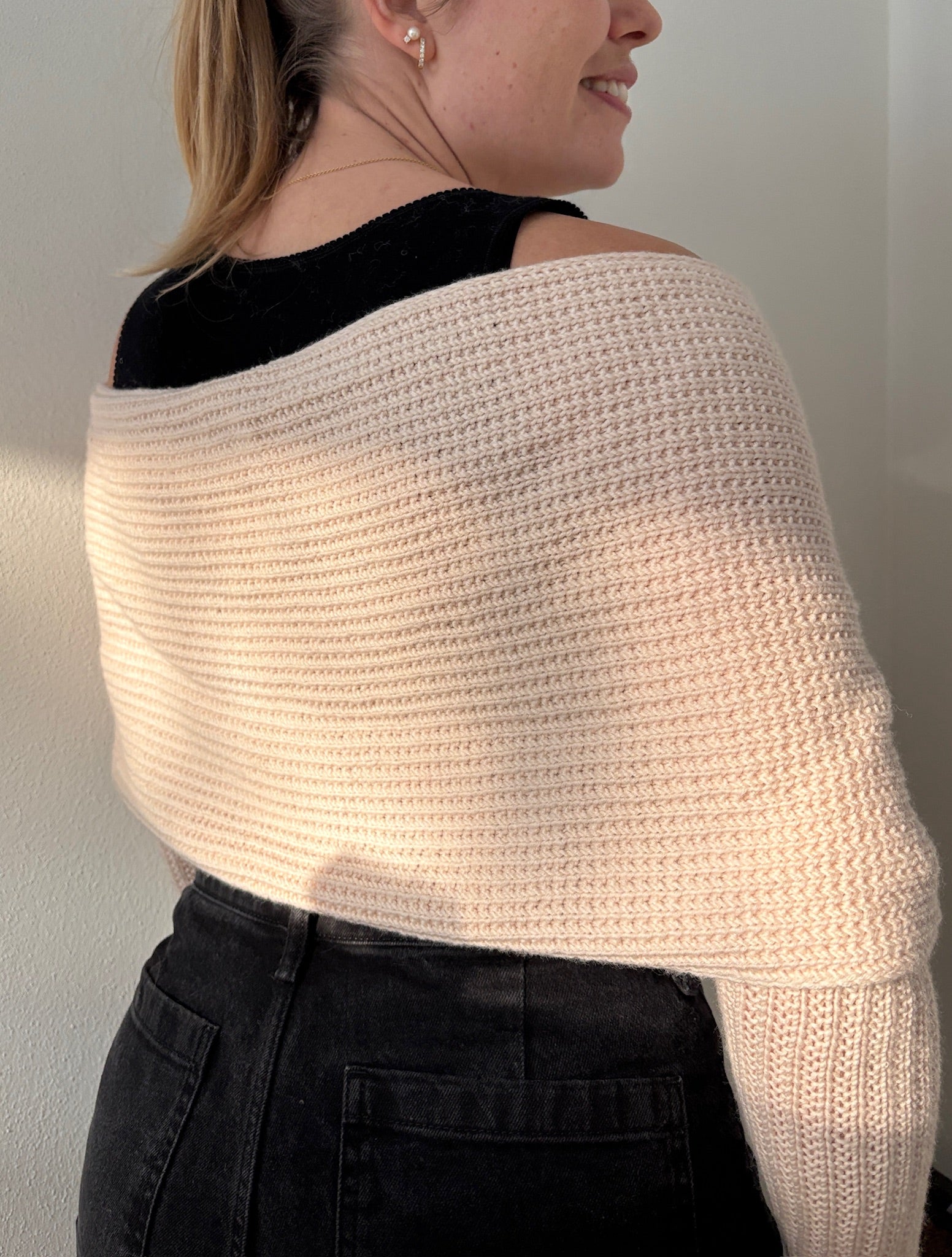 Easy Shape Sweater er perfekt til at varme skuldre og arme over eksempelvis en kjole. Det er også muligt at bruge designet som halstørklæde eller kombineret hue og halstørklæde. Opskriften strikkes fra den ene ende til den anden i mønsteret perlerib.