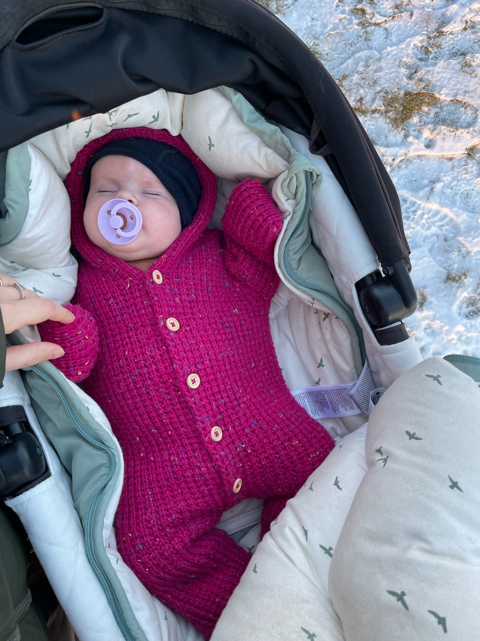 Denne heldragt er strikket oppefra og ned i perlerib. Heldragten er en oversizemodel, der er velegnet som overtøj i for eksempel barnevognen.