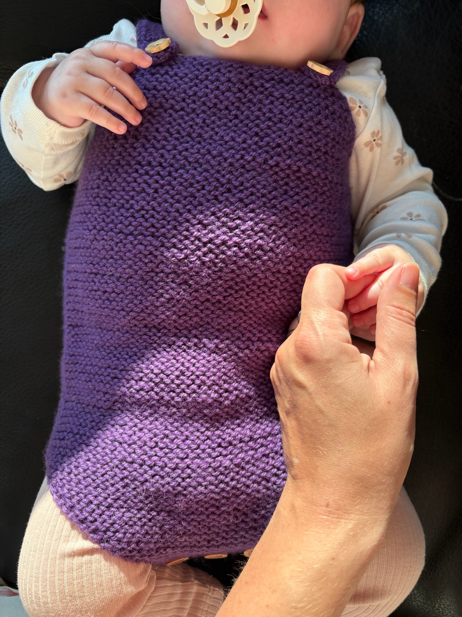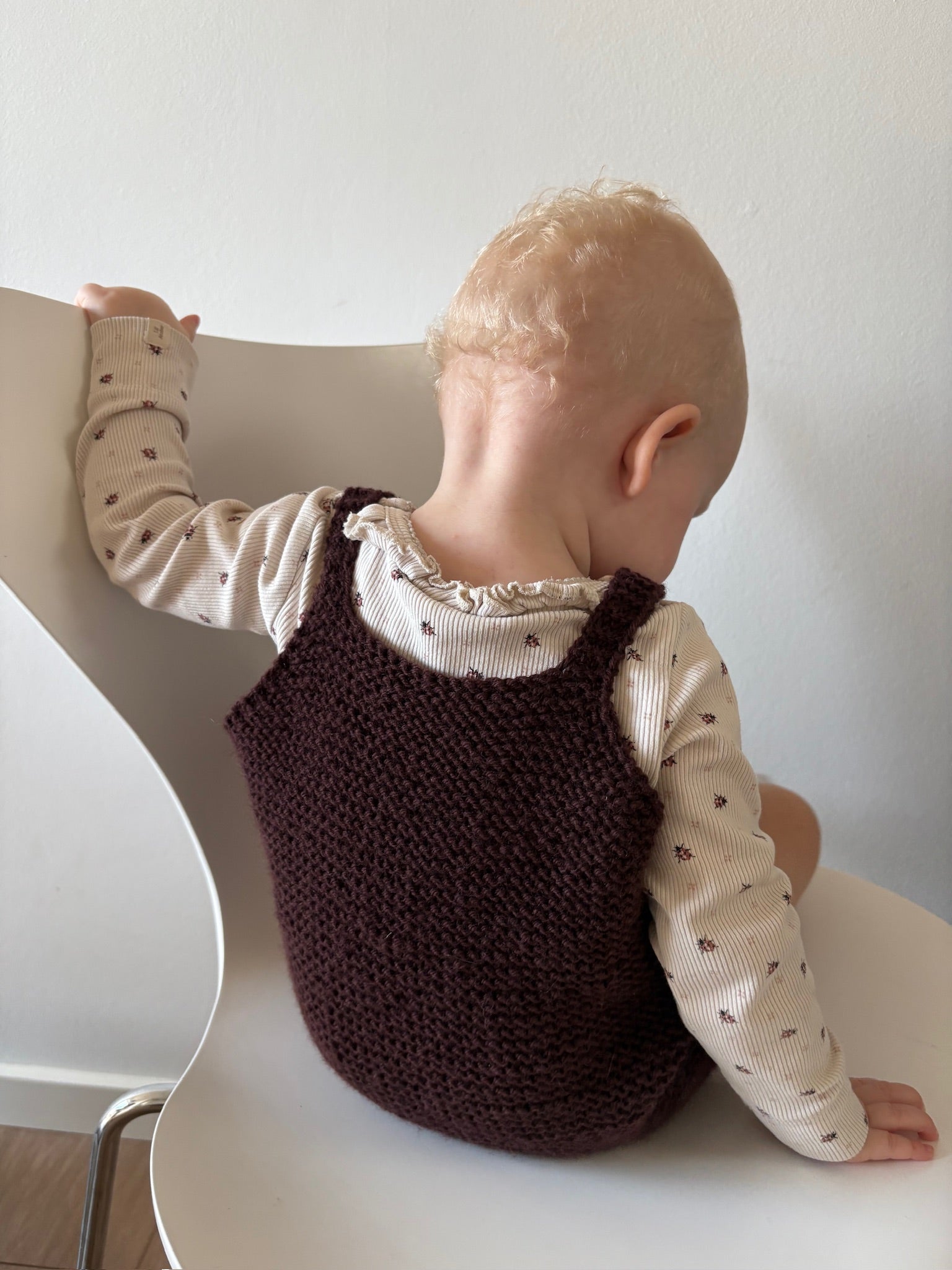 Denne romper til baby er perfekt over en body og et par strømpebukser. Den strikkes udelukkende i retstrik og med simple teknikker. Romperen er derfor et oplagt projekt til begynderen.
