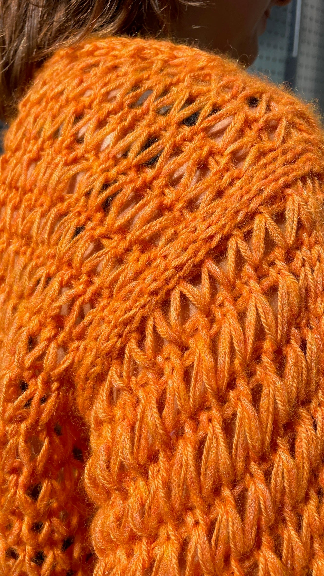 Easy Breezy Sweater ist ein etwas oversized Pullover, der von oben nach unten im Lochmuster gestrickt wird. Das Lochmuster wird durch das Stricken «langer Maschen» geformt. Der Pullover hat einen einfachen Ausdruck mit U-Boot-Ausschnitt und I-Cord Rändern an den Ärmeln und im Bund des Pullovers.