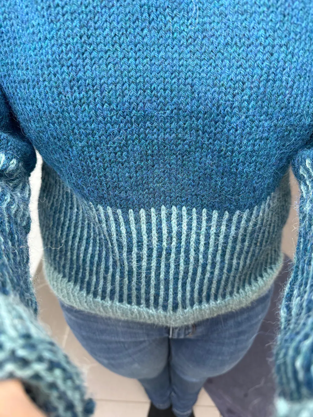 Der Pullover wird in zwei Farben gestrickt: einer Grundfarbe für den oberen Teil des Pullovers, und einer Kontrastfarbe, die im unteren Teil des Pullovers mit der Grundfarbe kombiniert wird.