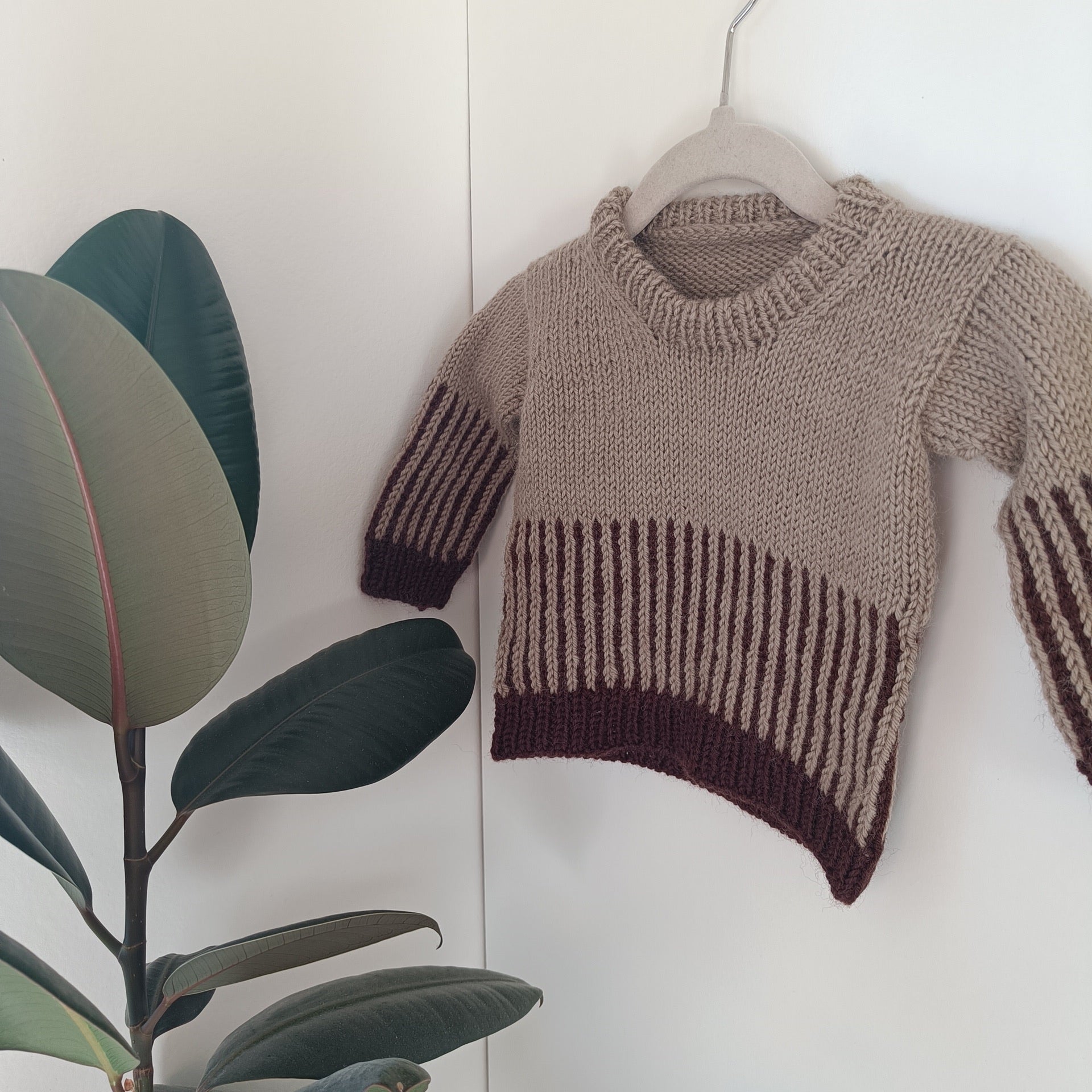 Der Pulli wird in zwei Farben gestrickt: einer Grundfarbe, in der der obere Teil des Pullis gestrickt wird, und einer Kontrastfarbe für den Bund des Pullis.