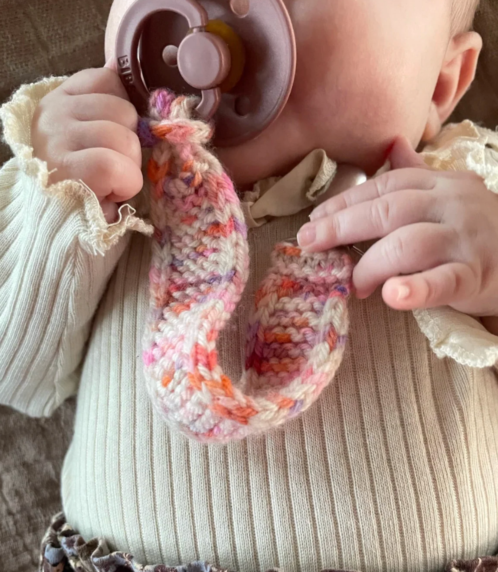 The Easy Pacifier Chain is a simple and beginner friendly pacifier chain. It is worked back and forth in a garter stitch and it has beautiful i-cord details.