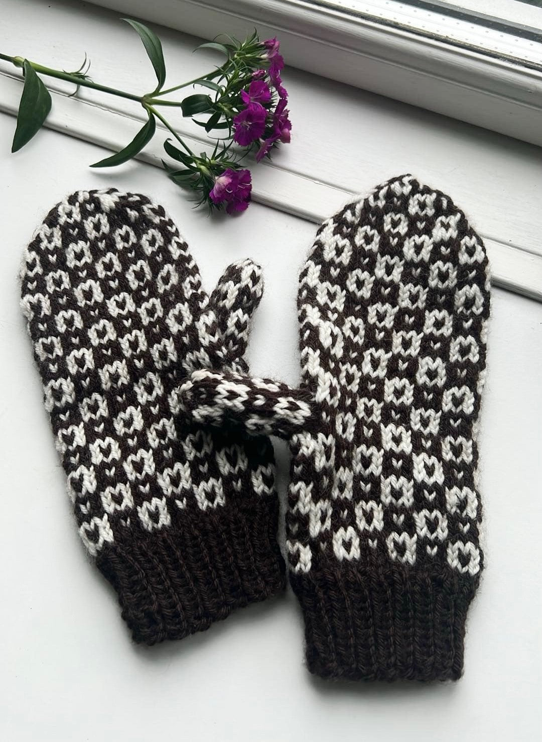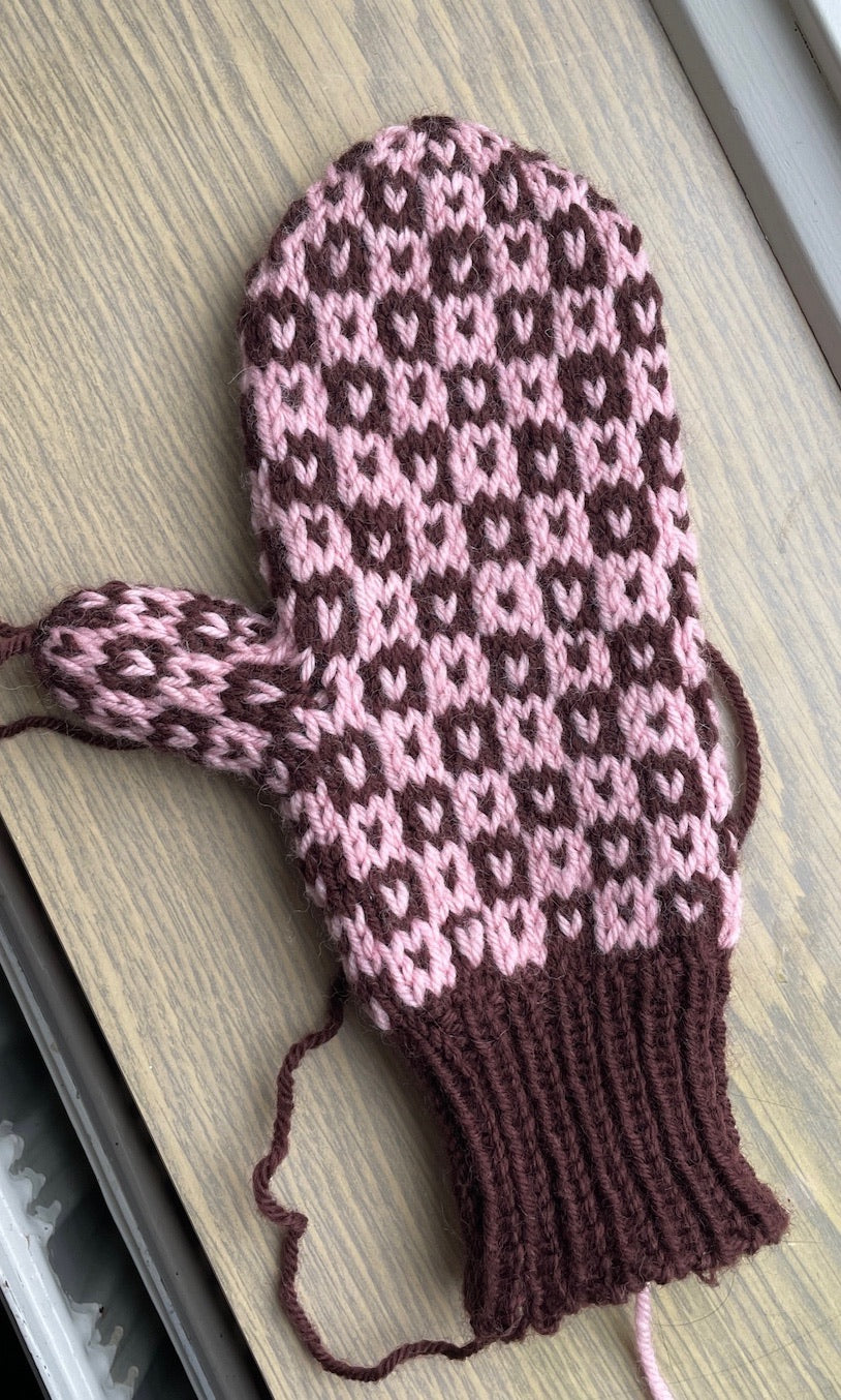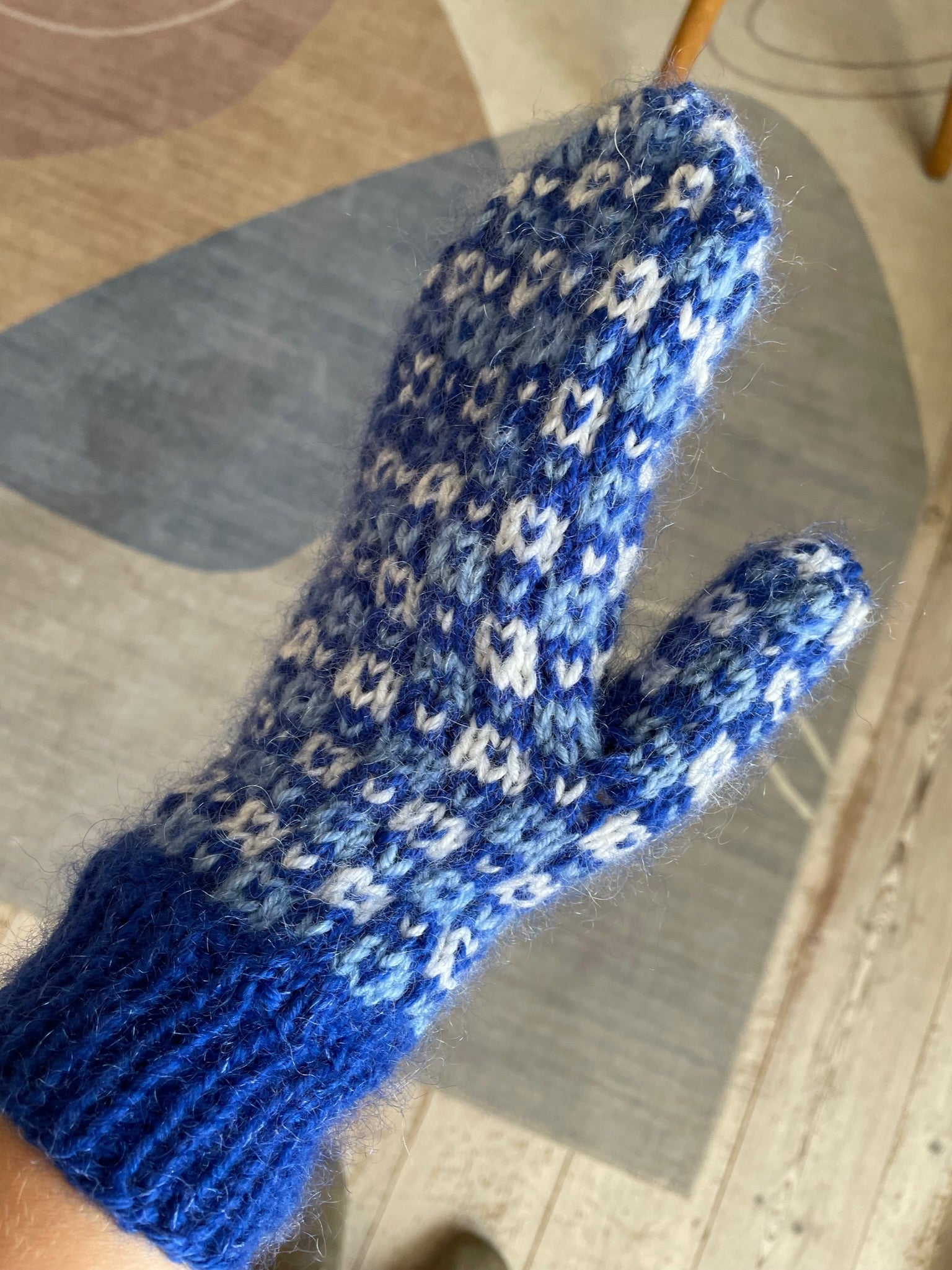Da jeg strikkede den første vante, var det en højre vante, da jeg lavede tommeltotten ved de første 6 masker. Da jeg var igennem opskriften, stod der til sidst en linje om at ved venstre vante skulle man lave tommeltotten ved de sidste 6 masker. Da jeg havde lang tid mellem den første og den anden vante, glemte jeg hvad der stod til sidst i opskriften og fik lavet endnu en højre vante. Derfor var det blot en tanke, at det kan være nævnt undervejs, når man tager masker fra til tommel, at man skal være obs på om det er højre eller venstre man er i gang med :D