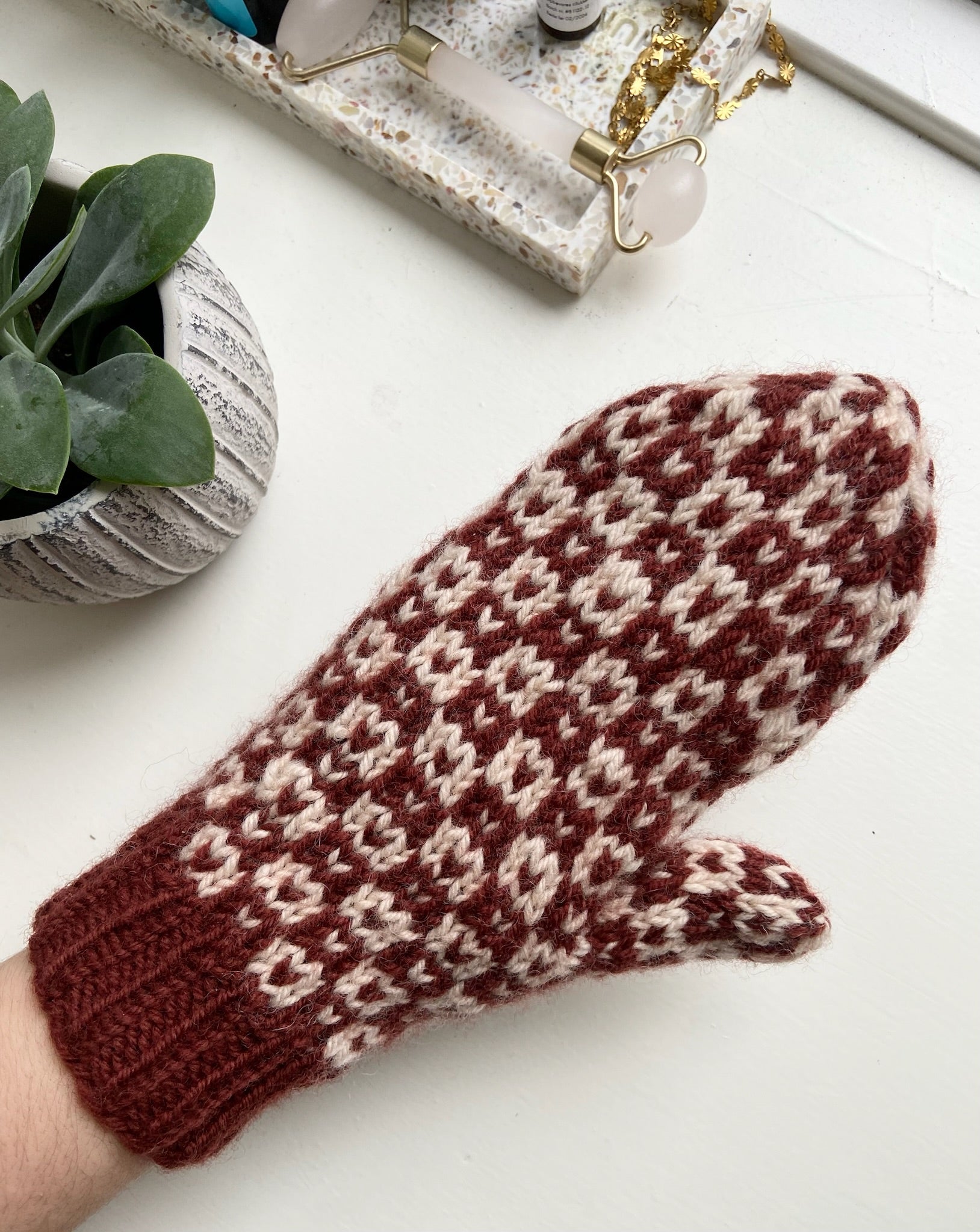 Easy Colour Mittens er et par votter som strikkes i et enkelt tofarget mønster. Vottene har en ribbkant langs håndleddet.