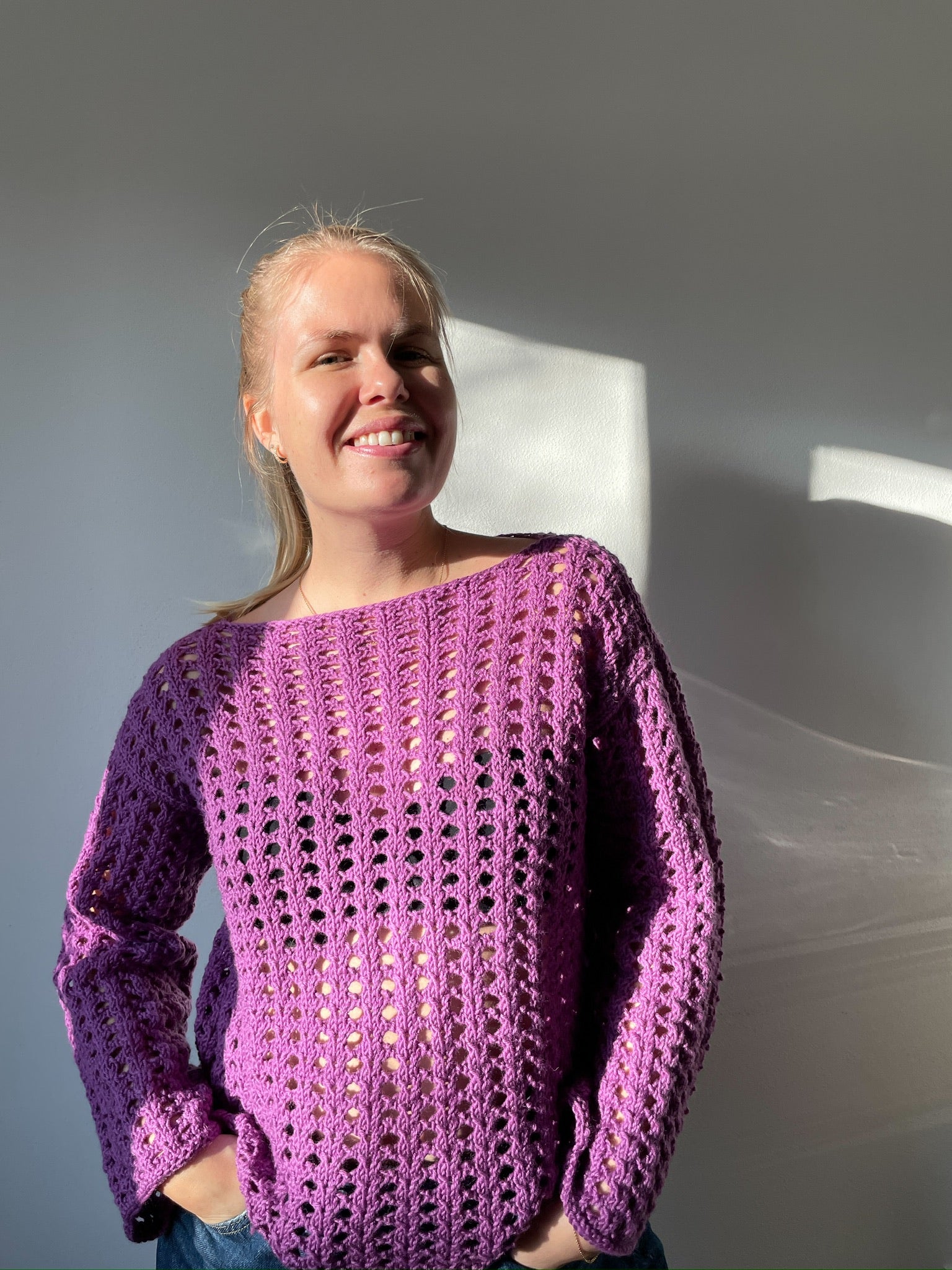 I knitted this in Drops Belle, but think the result would be better/prettier with the wool alternatives. Otherwise a fun project and nice way to learn knitting in a hole structure!