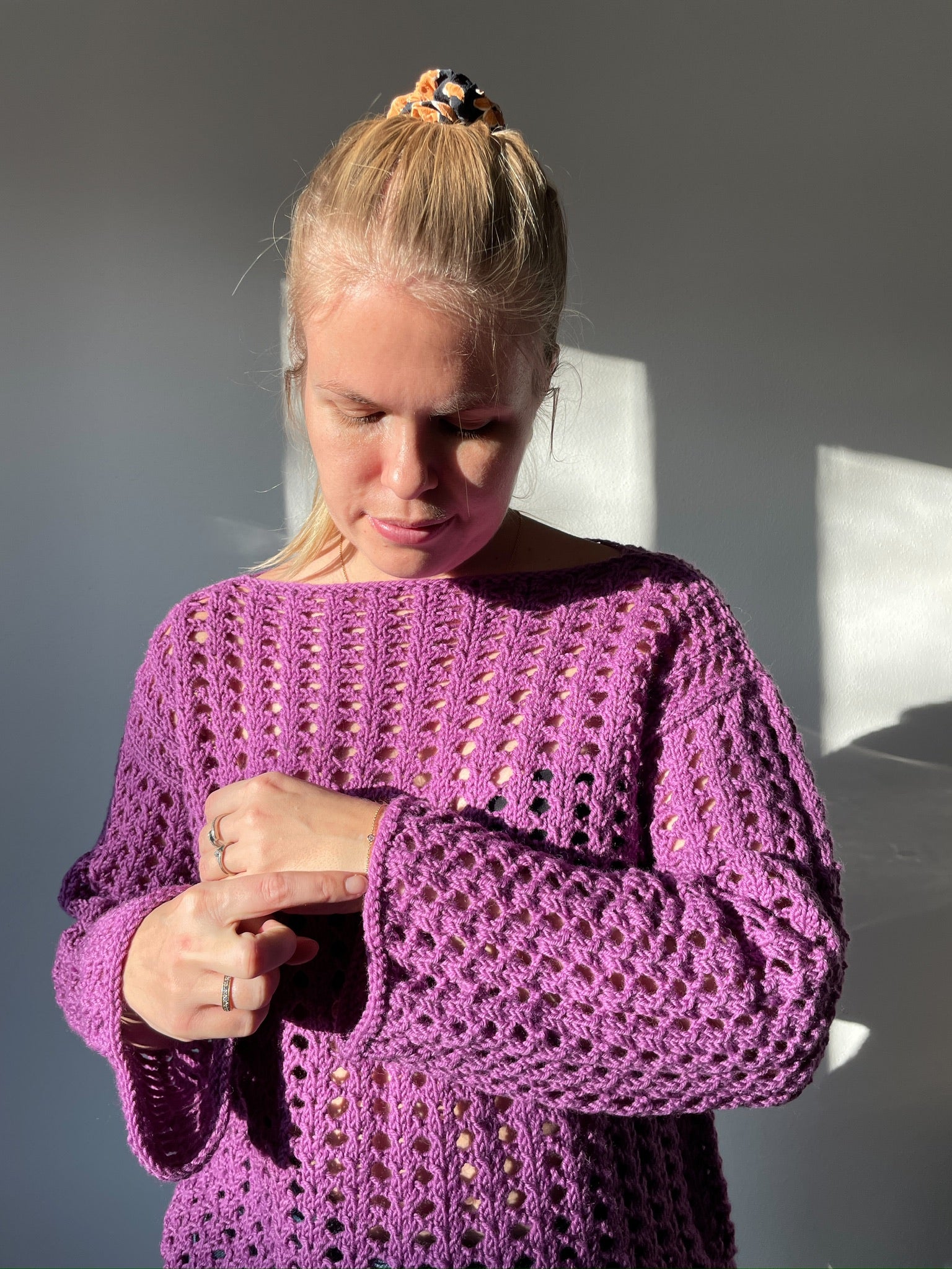 Easy Hole Structure Blouse er en litt oversized bluse som strikkes ovenfra og ned i hullmønster. Hullmønsteret strikkes ved å strikke økninger og kast. Blusen har et enkelt look med en båthals-utskjæring og rillekanter langs ermene og i bunnen av blusen.