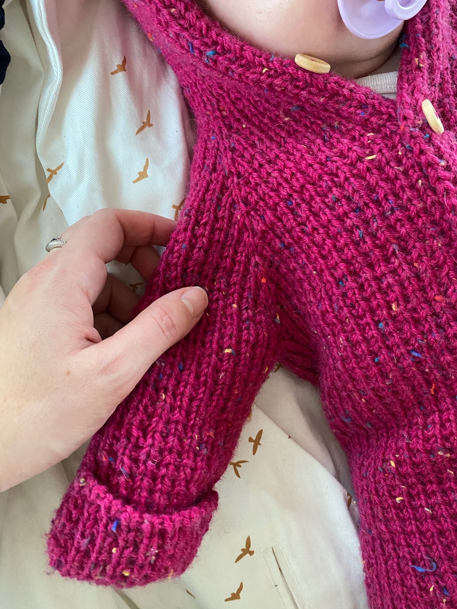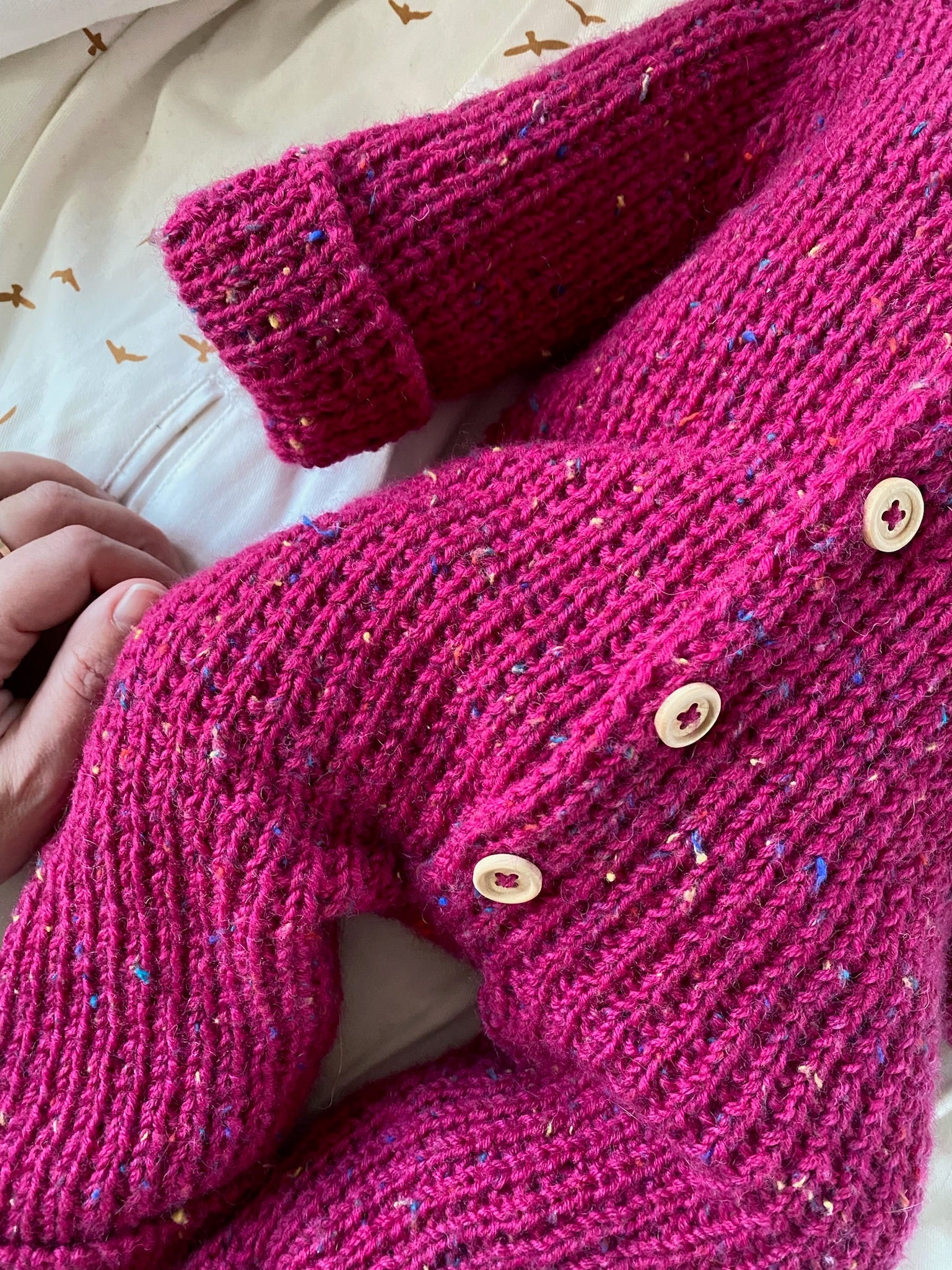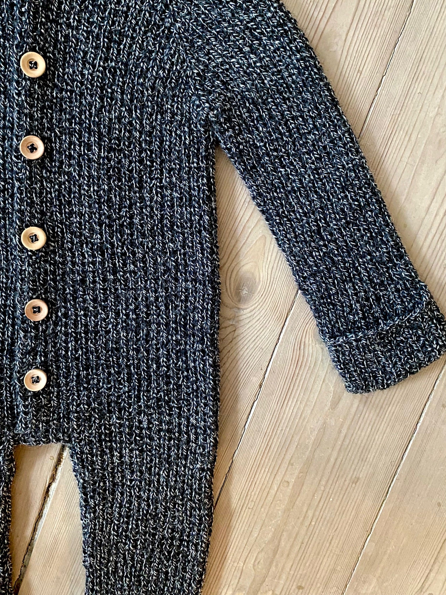 Heldressen strikkes ovenfra og ned i perleribb. Heldressen er oversized og passer derfor bra som yttertøy i for eksempel barnevognen.