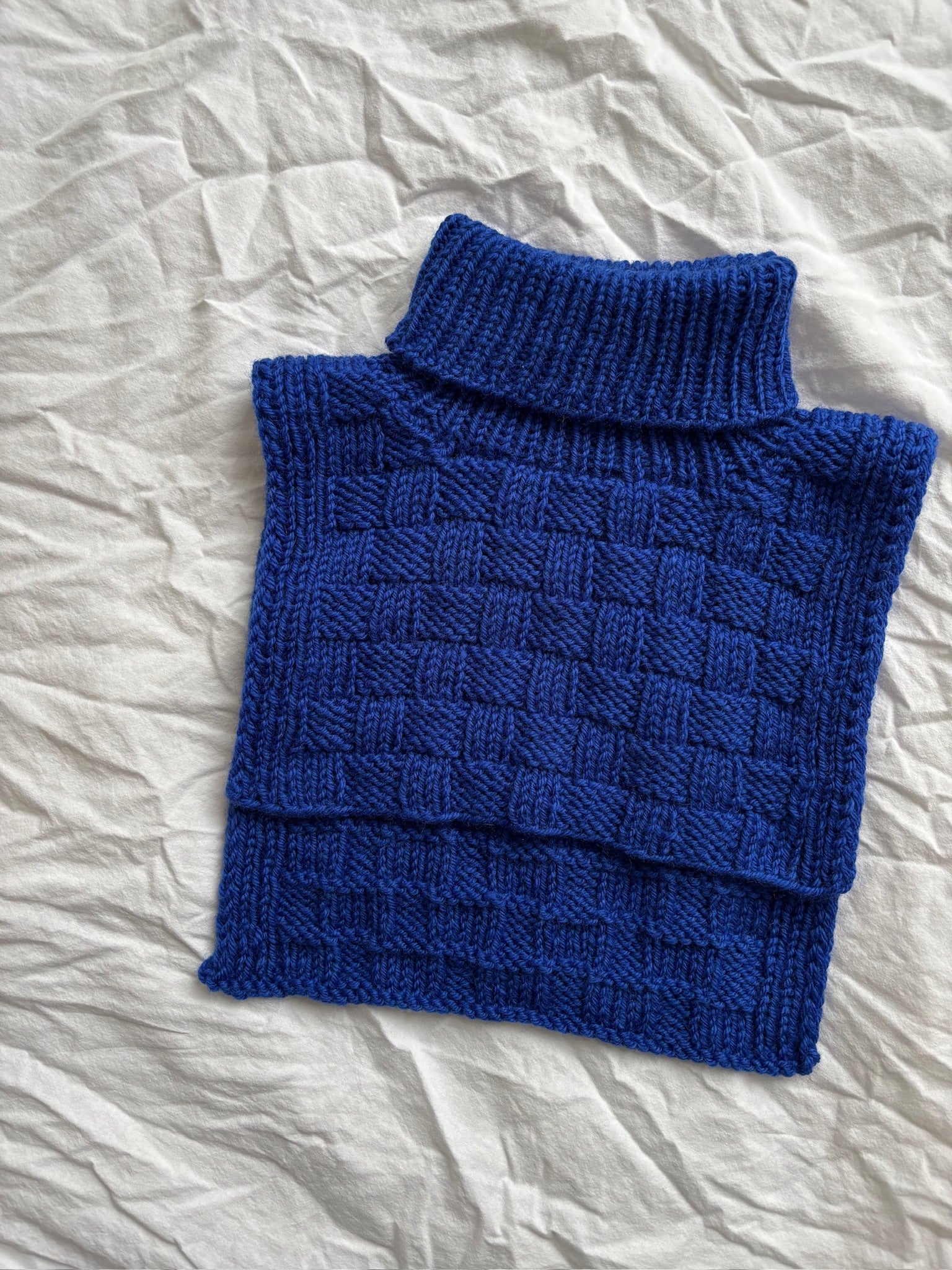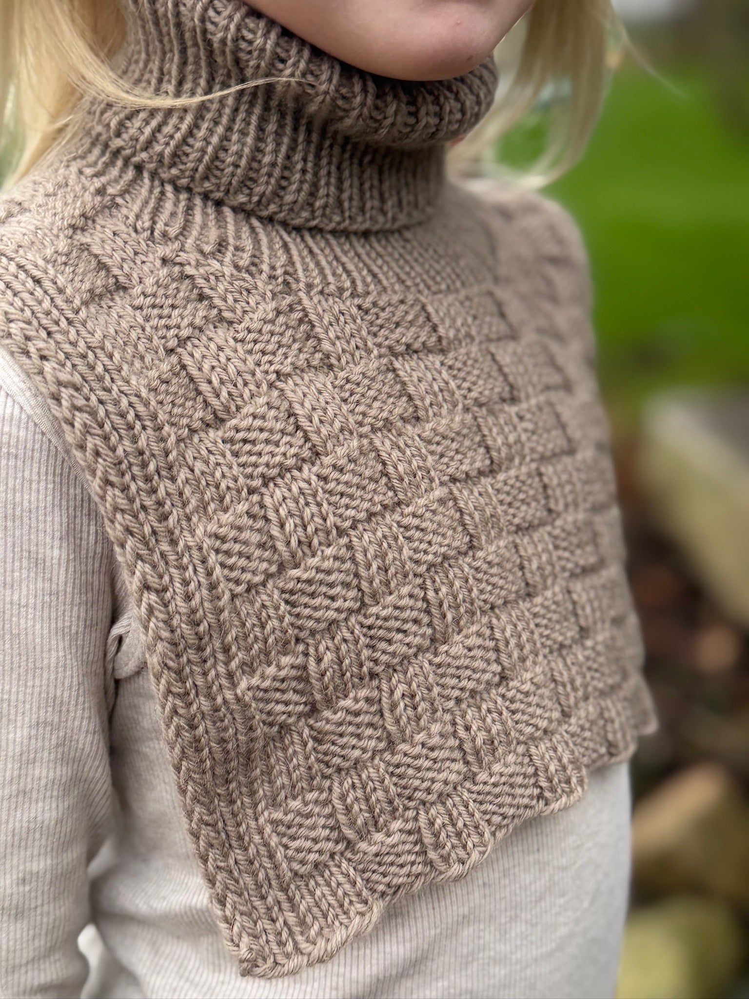 Strikkefasthet: 17 masker x 26 pinne i ternet mønster på pinne 4 mm = 10 x 10 cm.