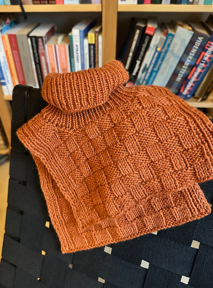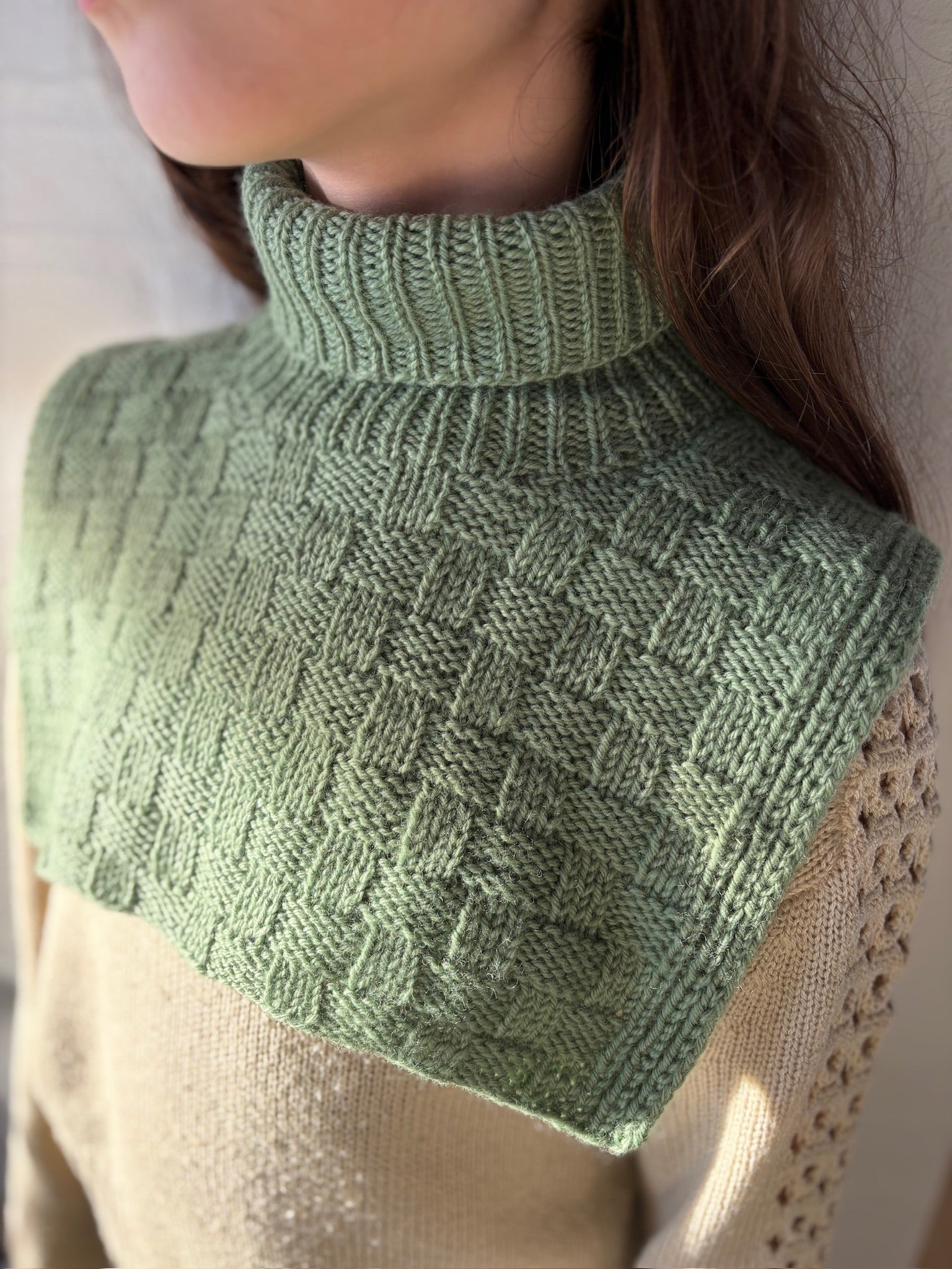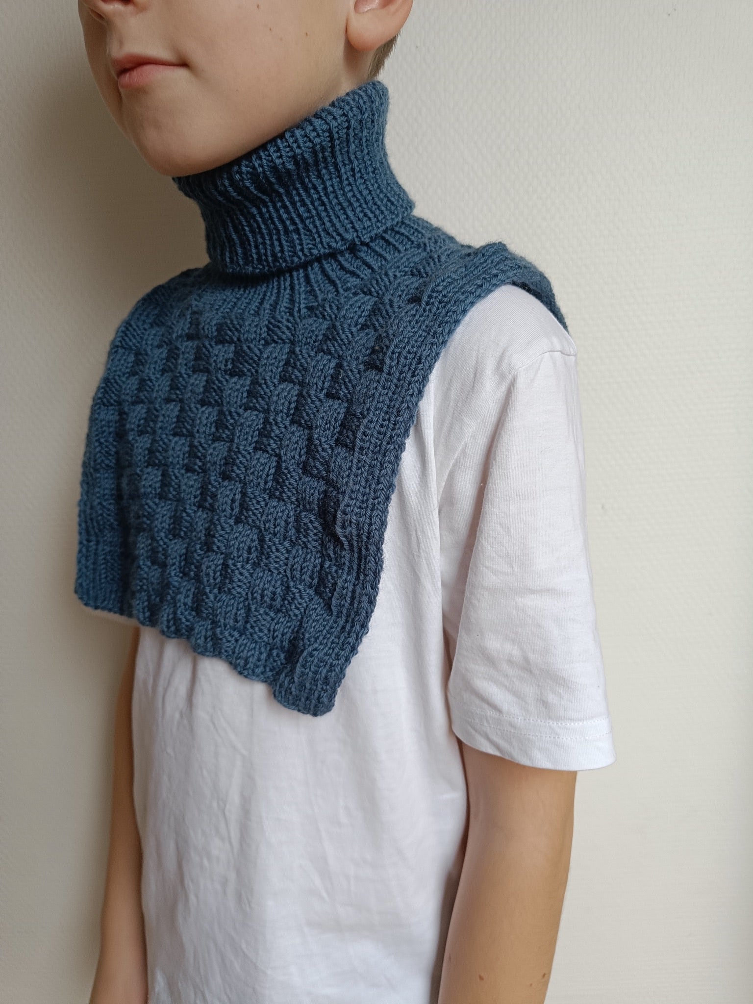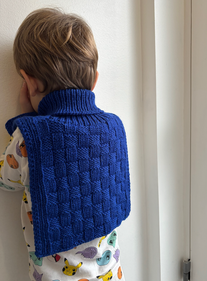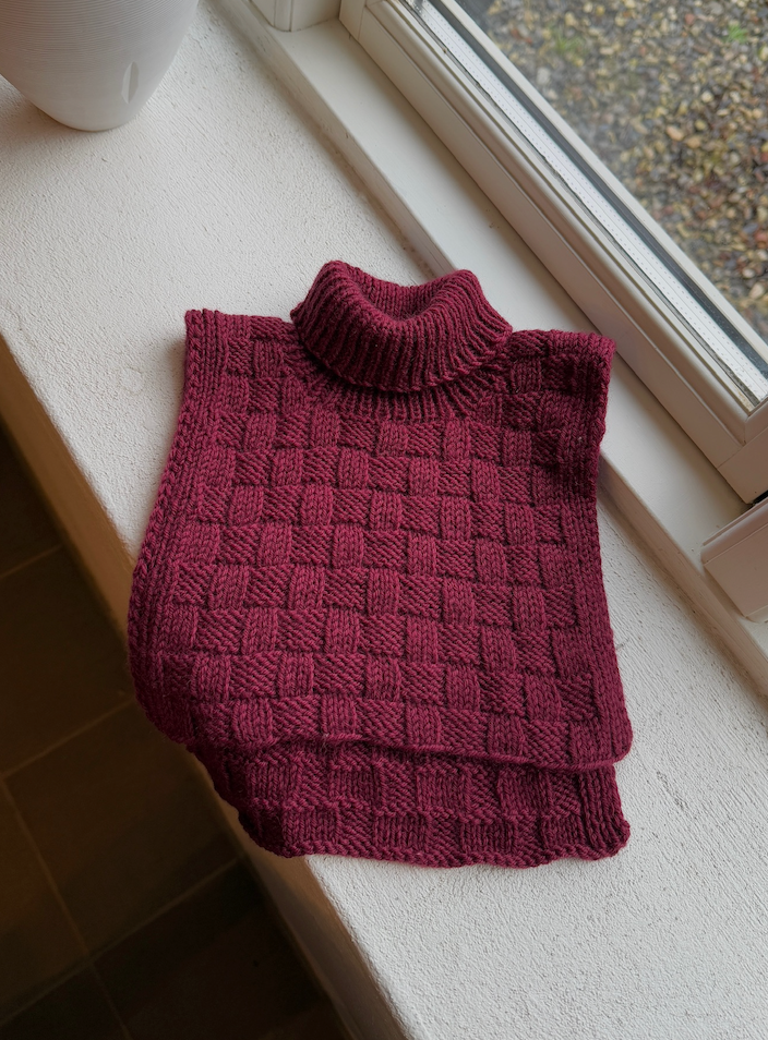 Easy Square Neck er en halsvarmer som strikkes i et nybegynnervennlig rutete mønster som kun består av rett- og vrangmasker. Først strikkes forstykket, deretter strikkes det videre på bakstykket. Til slutt tilføyes halsen.