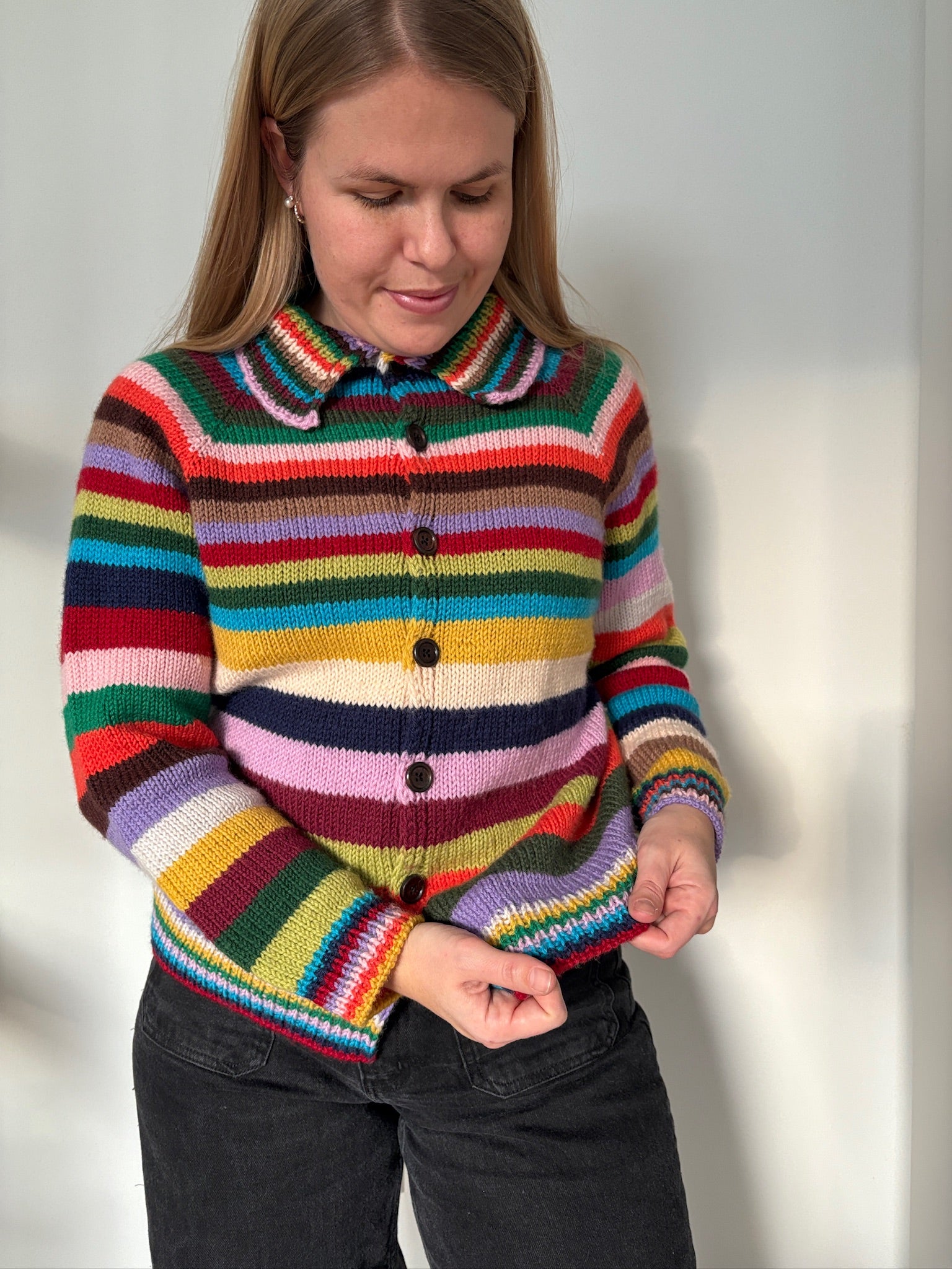 The Easy Polo Cardigan has a classic, yet exciting look with a nice collar and beautiful stripes of different widths. The cardigan is made with simple techniques, which makes it a beginner friendly project. The classic look of the cardigan makes it a great option to experiment with different colour combinations.