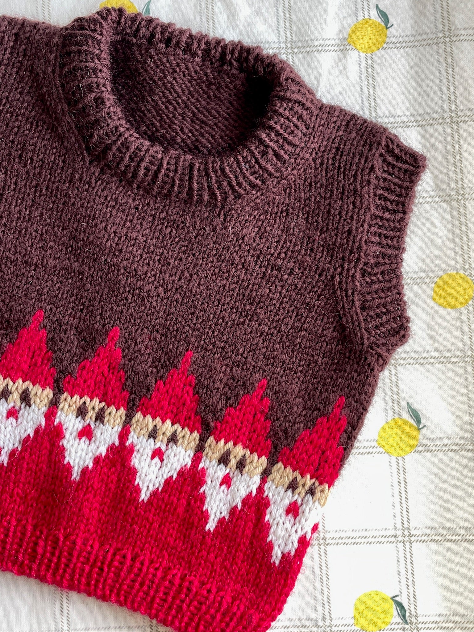 The slipover is worked in two colours: A base colour that the upper part of the slipover is worked in, and a contrast colour that the bottom of the slipover is worked in. Additionally, you will need a bit of brown/ black yarn for the eyes and a bit of beige yarn for the faces.
