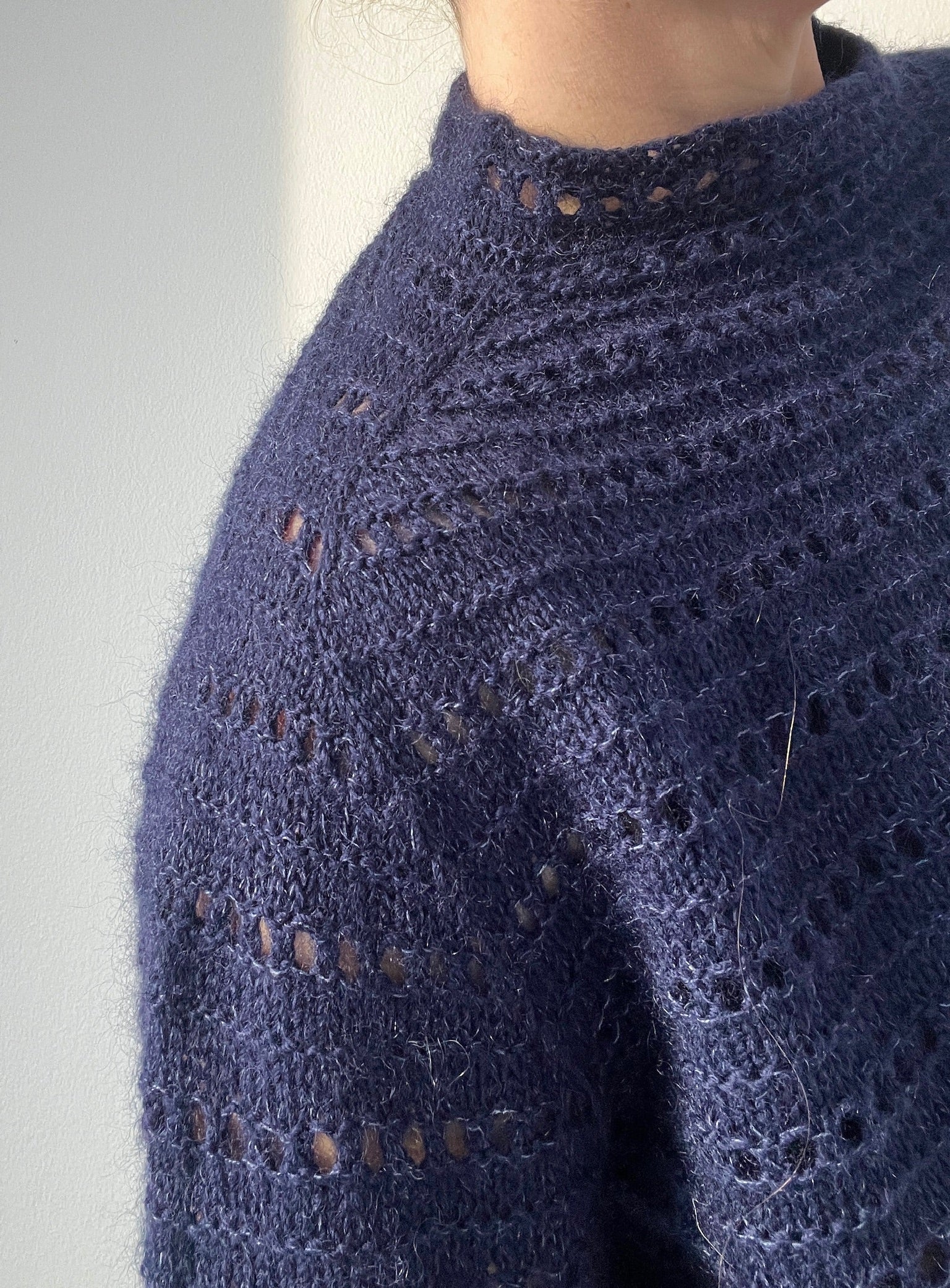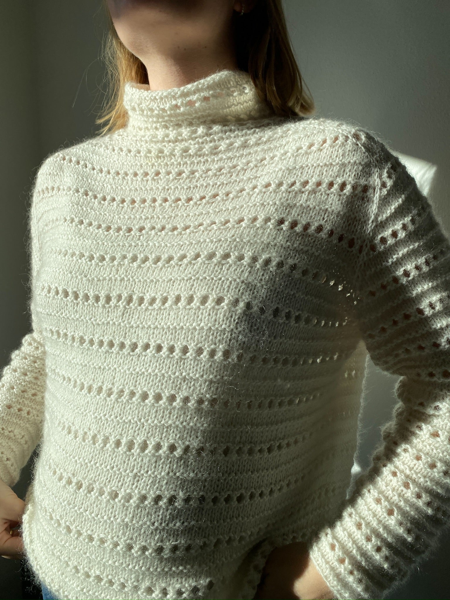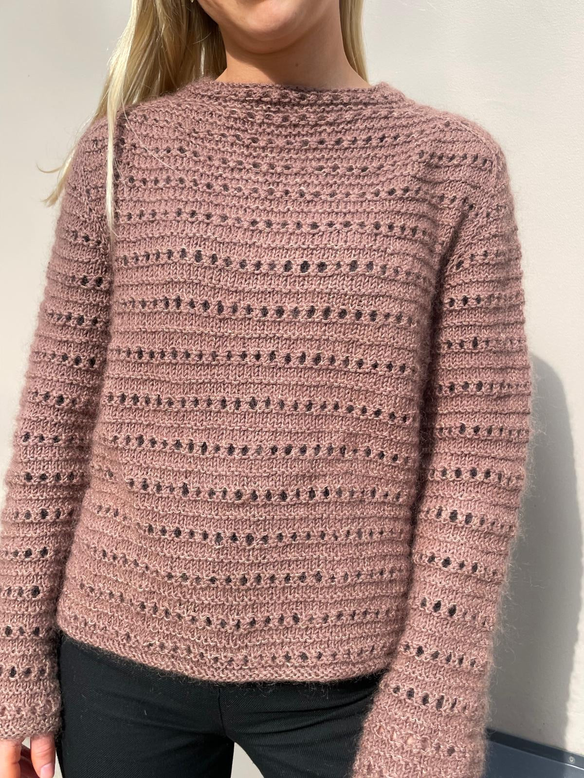 The Easy Spring Blouse has a feminine shape created with saddle shoulders and a short turtle neck. The blouse is worked from the top down in a simple, beginner friendly hole pattern. The combination of the hole pattern and the airy yarn alternatives creates a light and airy blouse - perfect for spring and summer.