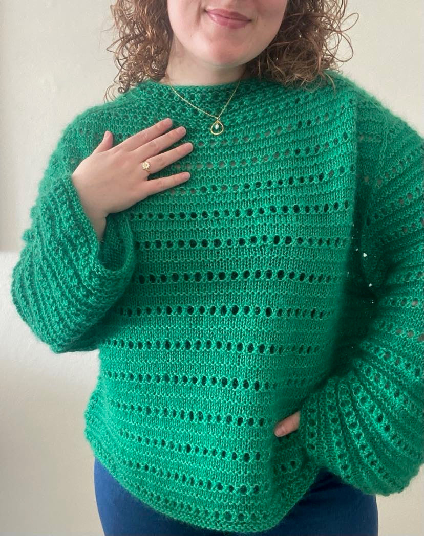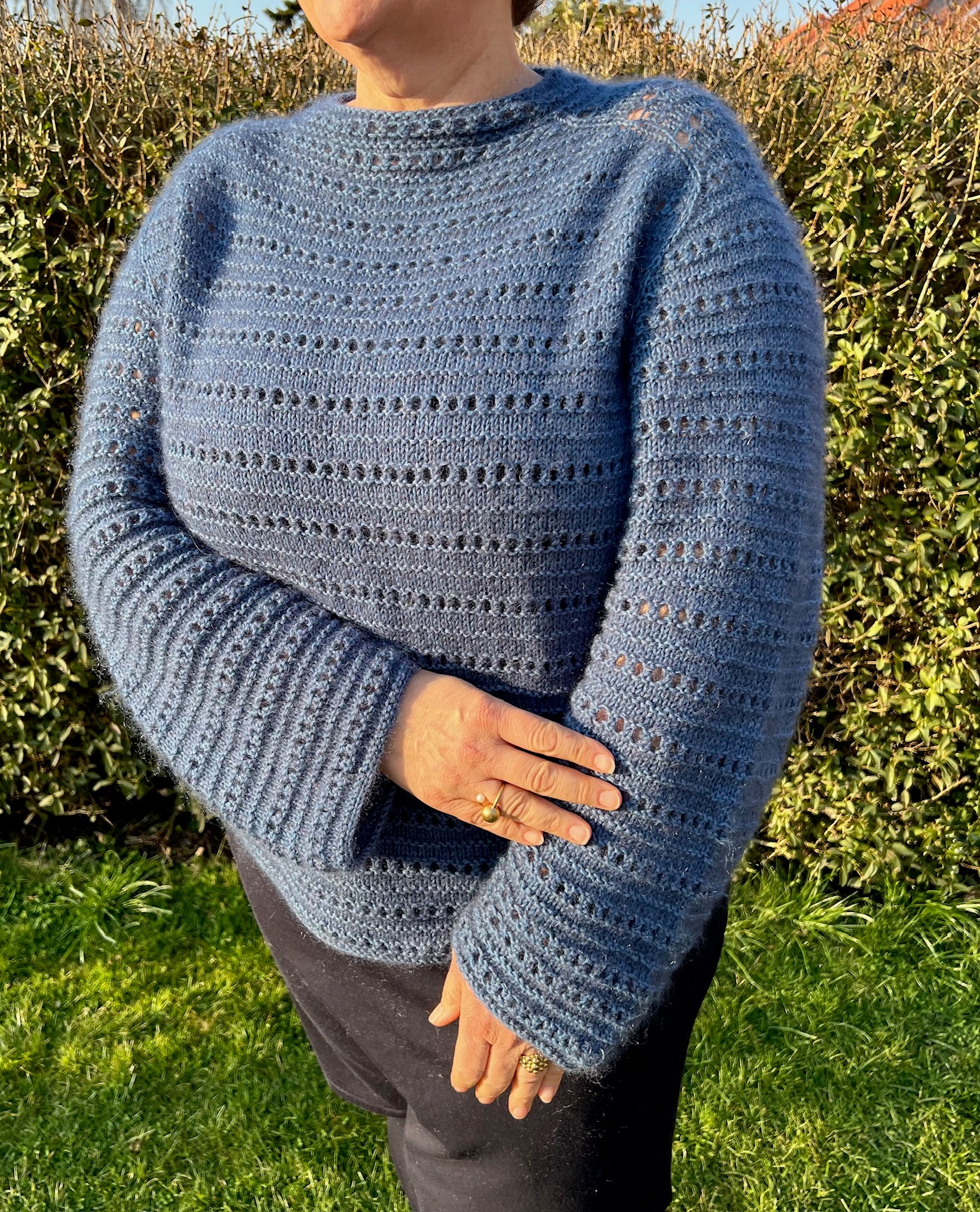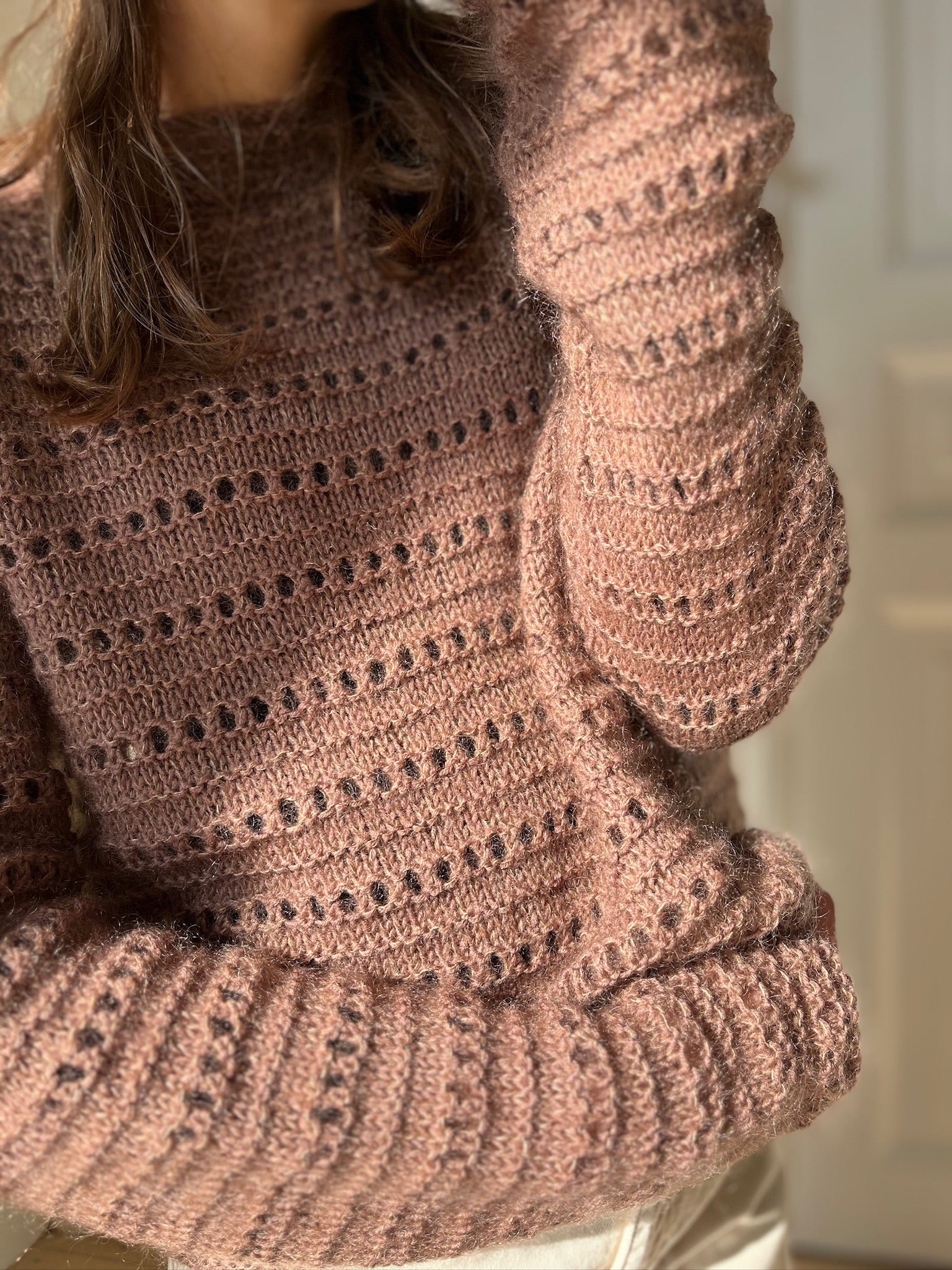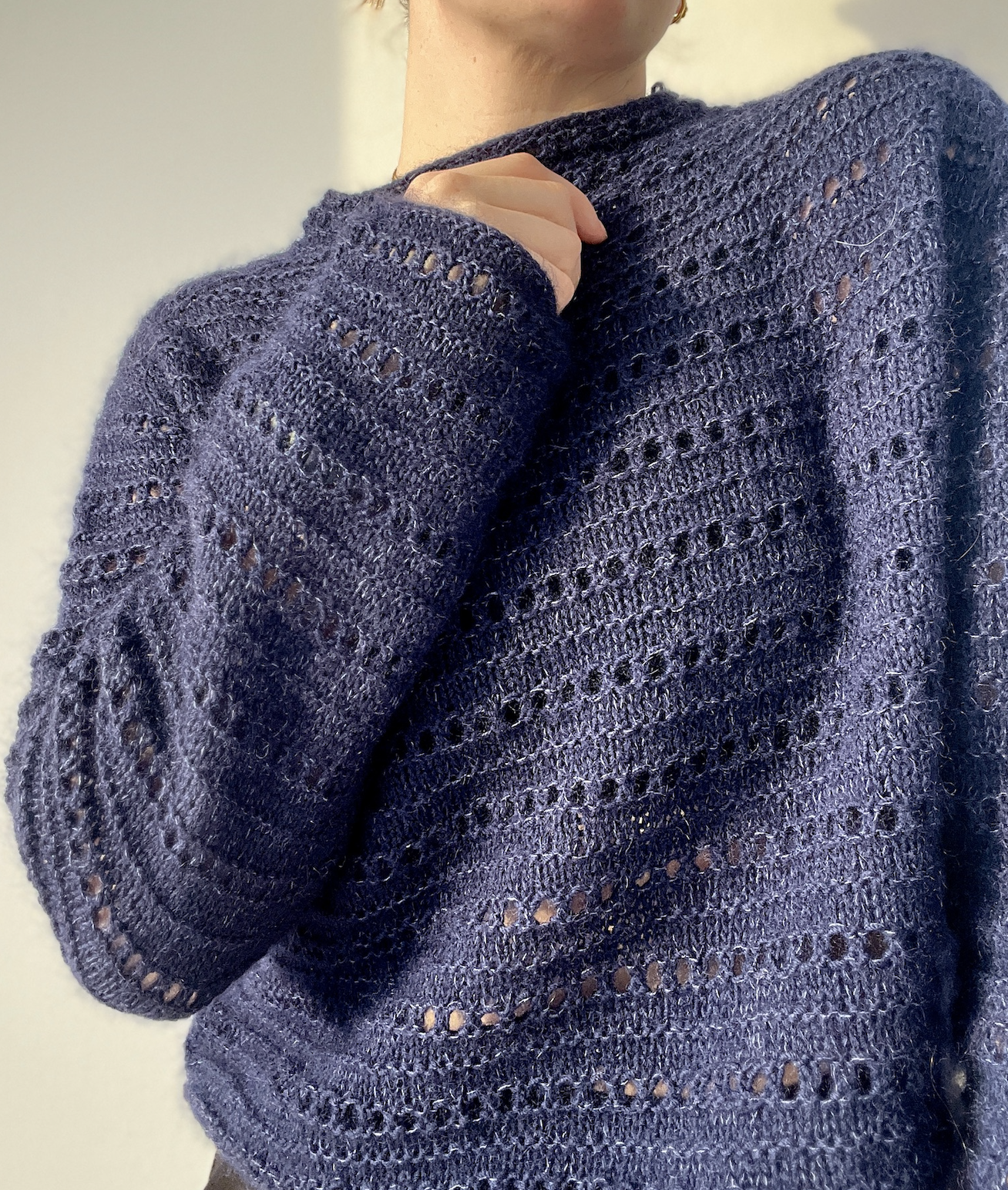 The Easy Spring Blouse has a feminine shape created with saddle shoulders and a short turtle neck. The blouse is worked from the top down in a simple, beginner friendly hole pattern. The combination of the hole pattern and the airy yarn alternatives creates a light and airy blouse - perfect for spring and summer.