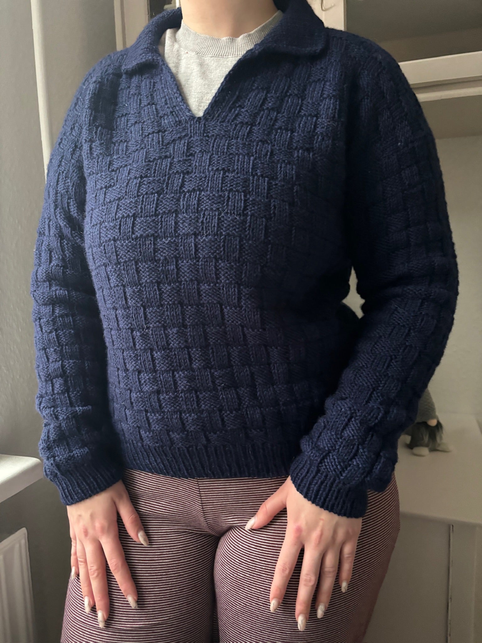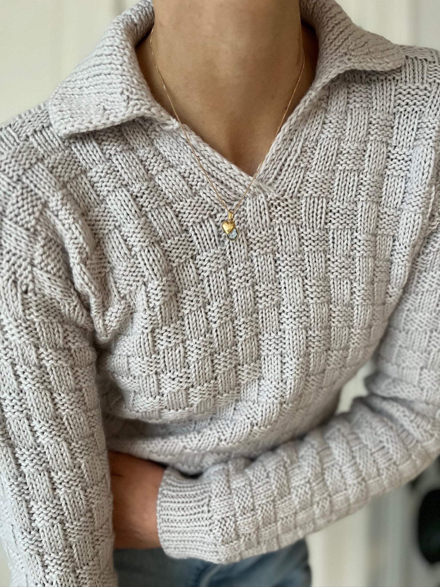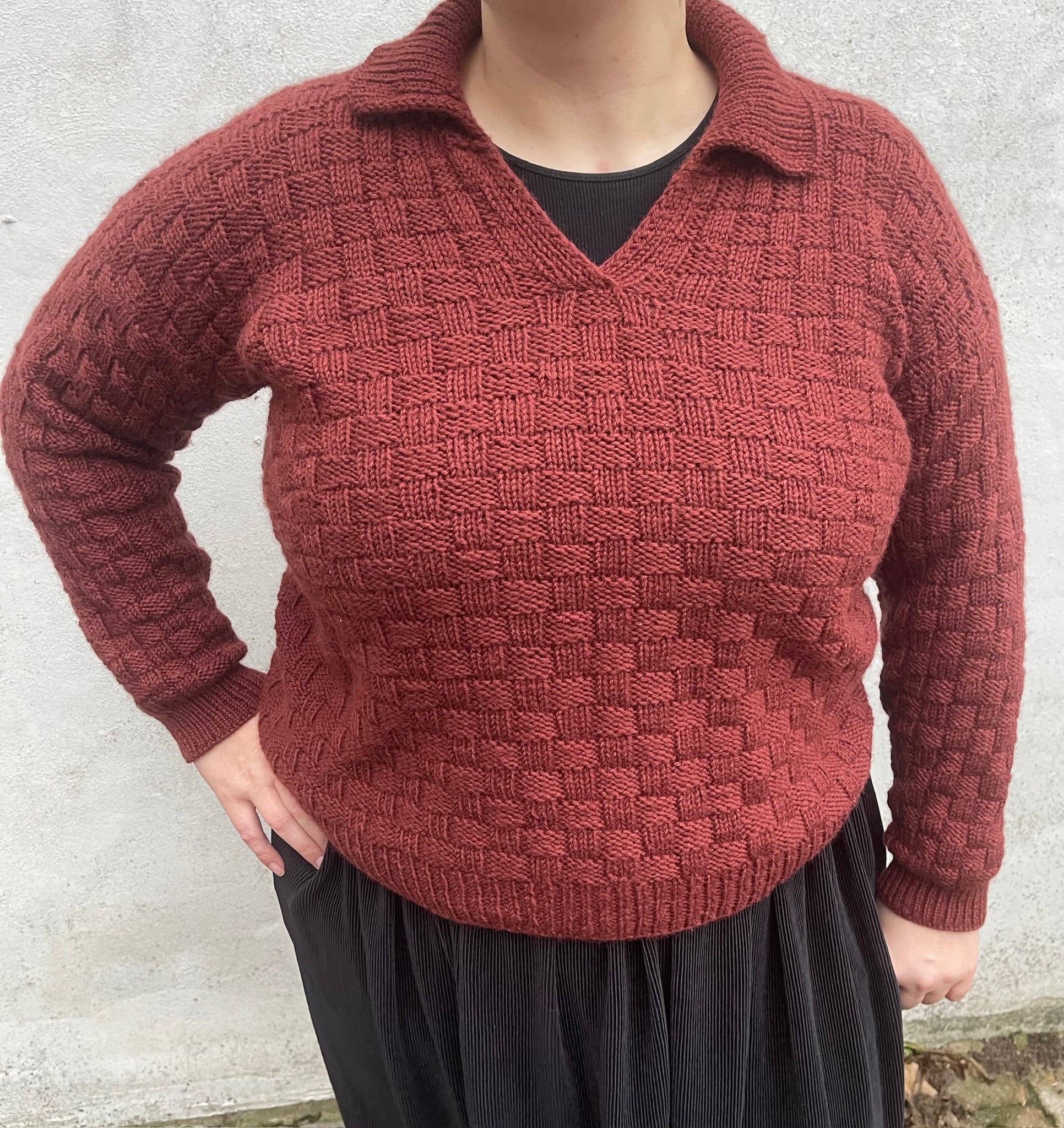 The Easy Square Polo Sweater is made in a beginner friendly chequered pattern that only consists of knits and purls. It is worked from the top down. Sleeves and collar are added at the end.