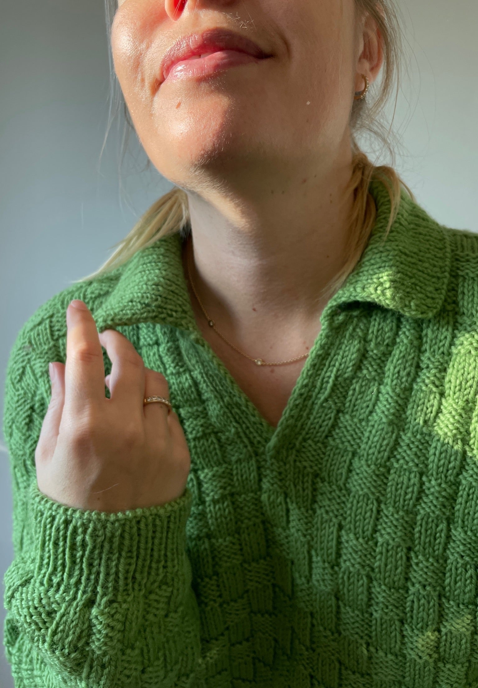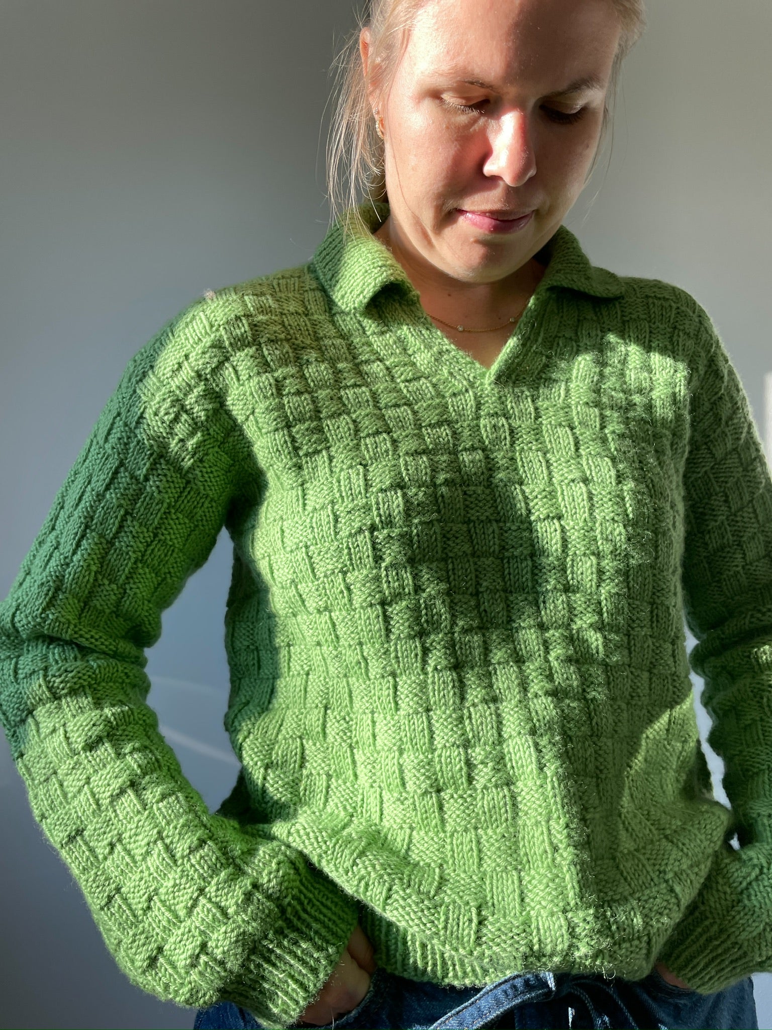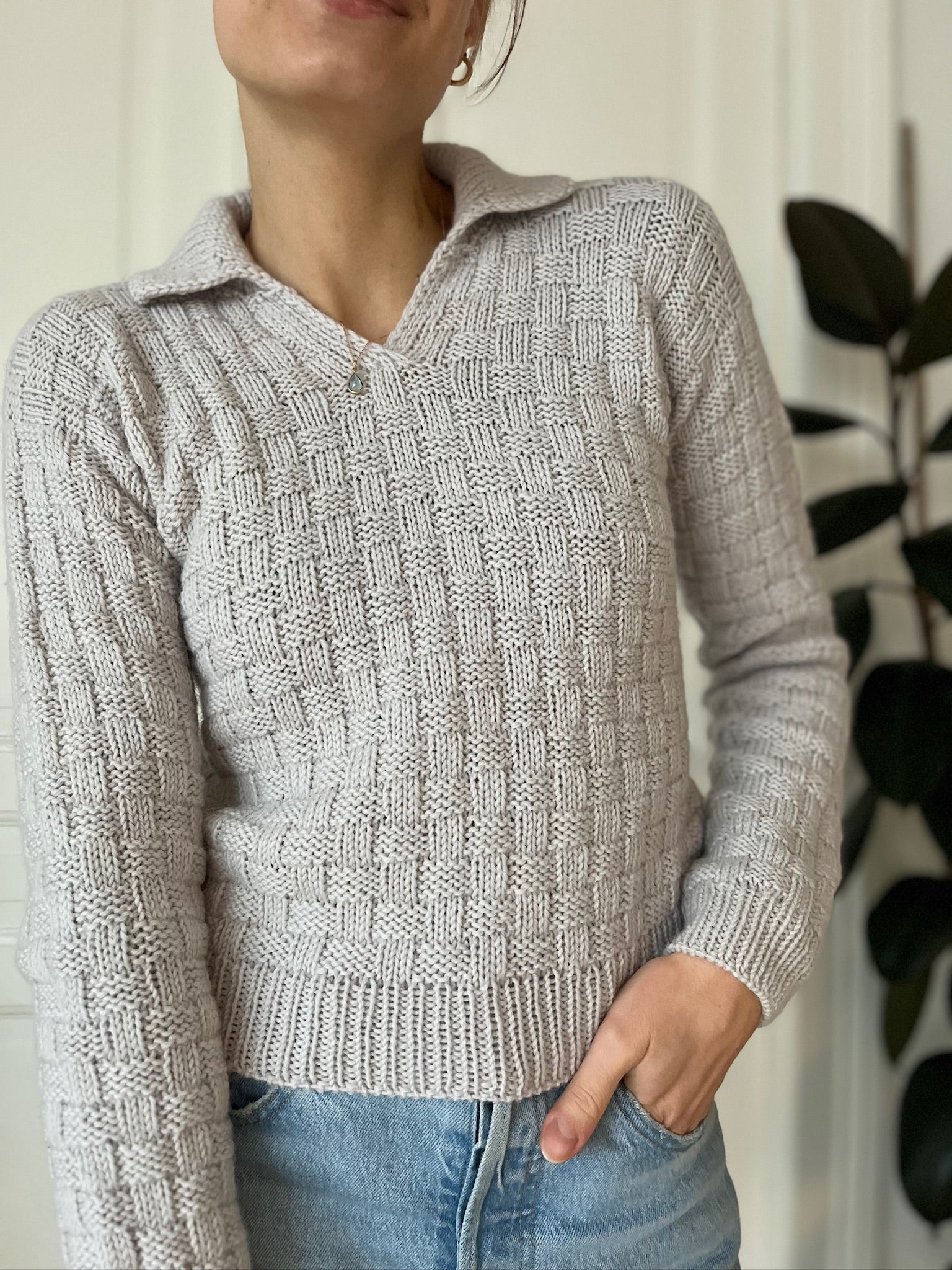 The Easy Square Polo Sweater is made in a beginner friendly chequered pattern that only consists of knits and purls. It is worked from the top down. Sleeves and collar are added at the end.