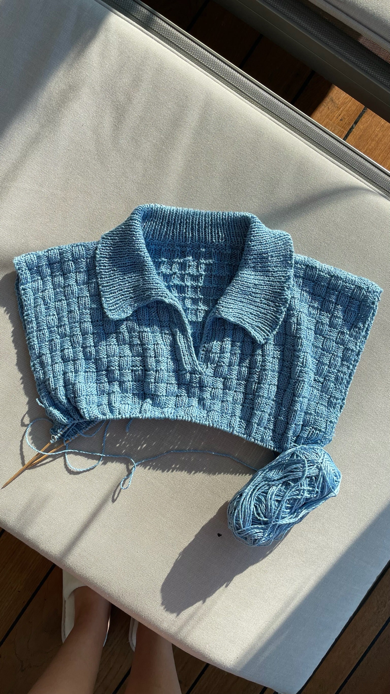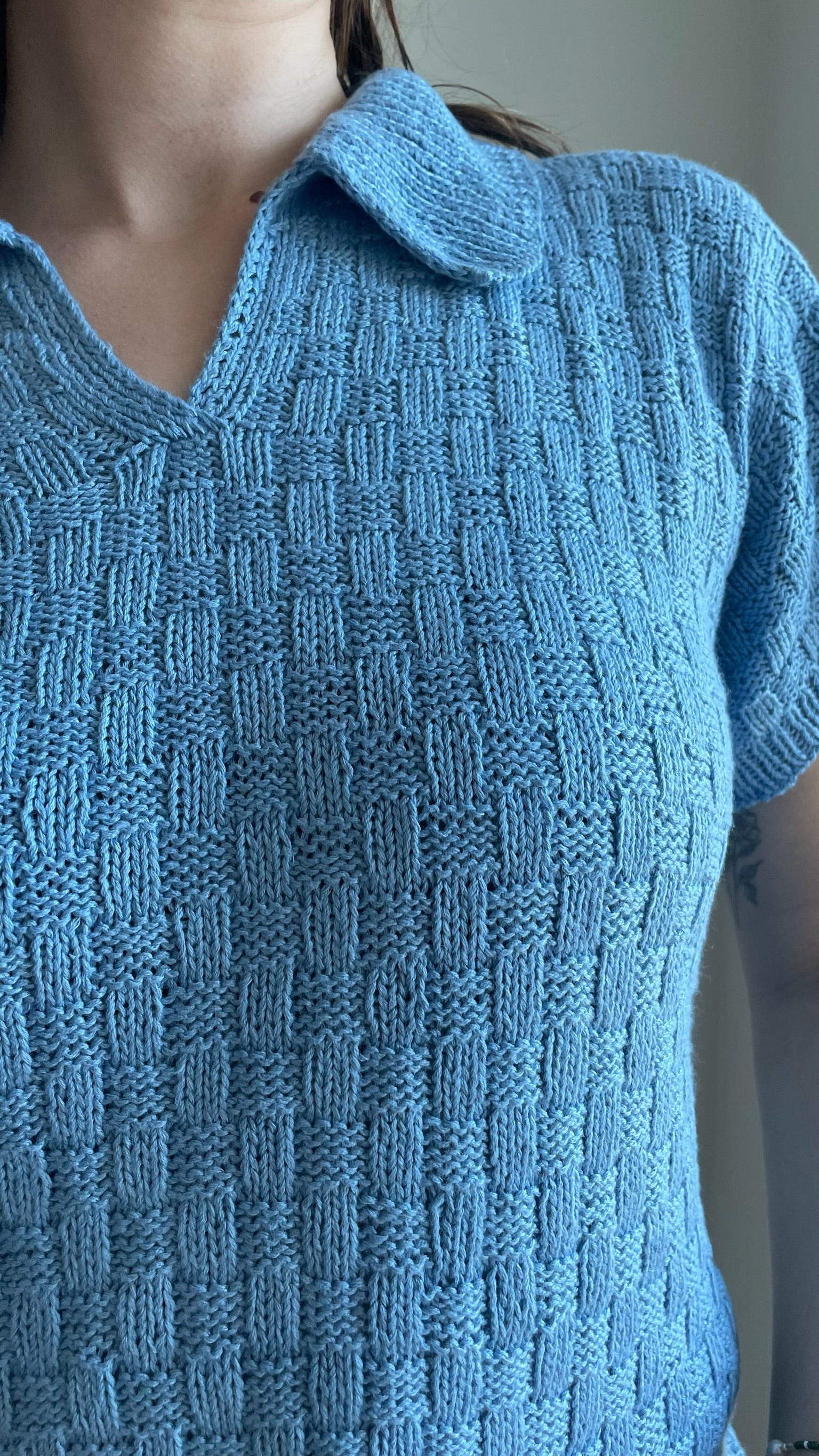 The Easy Square Polo Tee is made in a beginner friendly chequered pattern that only consists of knits and purls. It is worked from the top down. Sleeves and collar are added at the end.