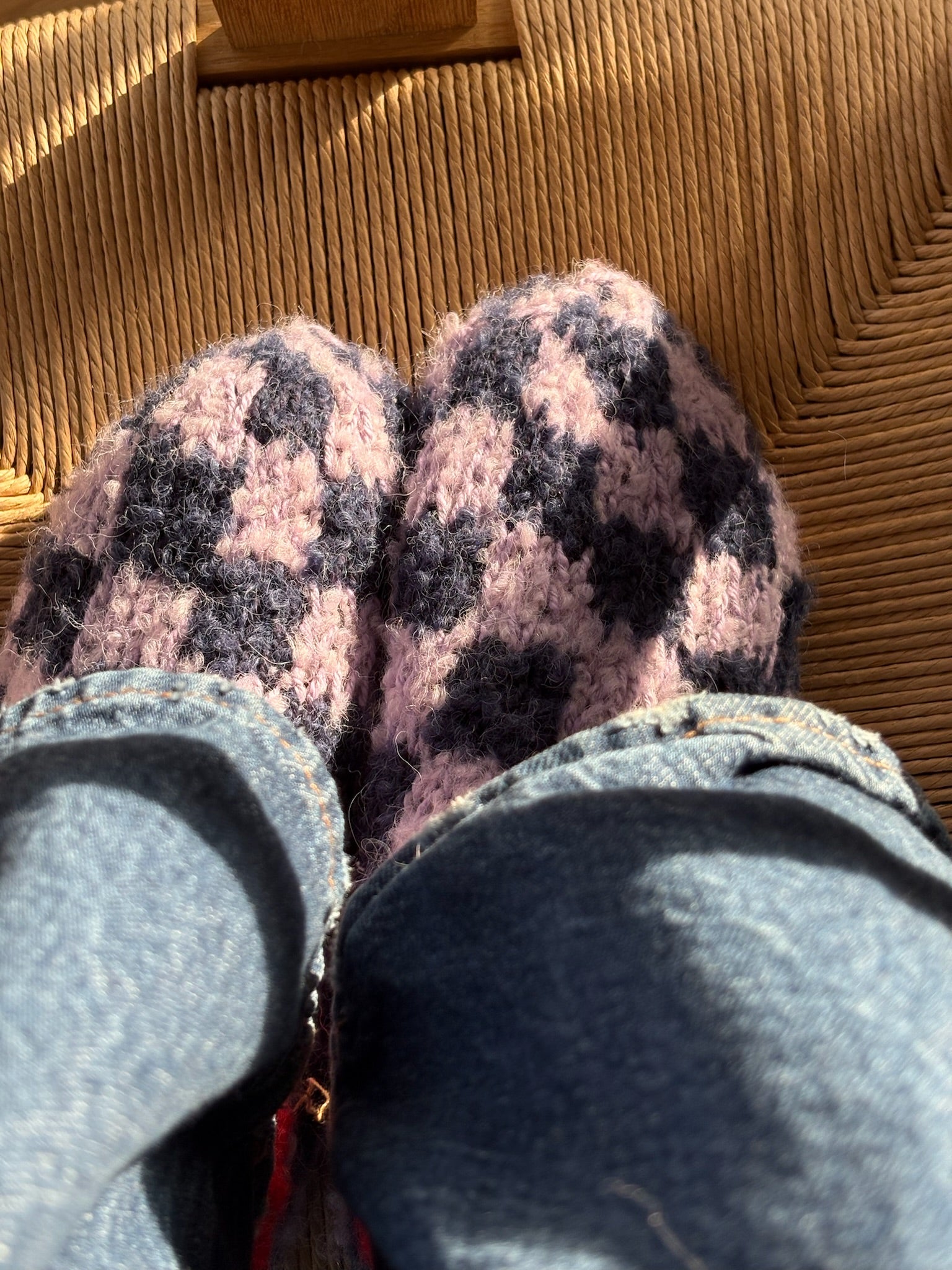 Easy Square Slippers is a pair of lovely slippers made in a chequered colour texture. The construction is simple and worked in the round in a stockinette stitch with two colours. The slippers are then double folded to make them nice and warm. The slippers are worked from the top and down towards the toe.