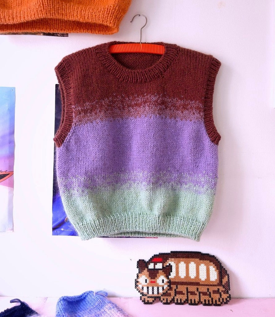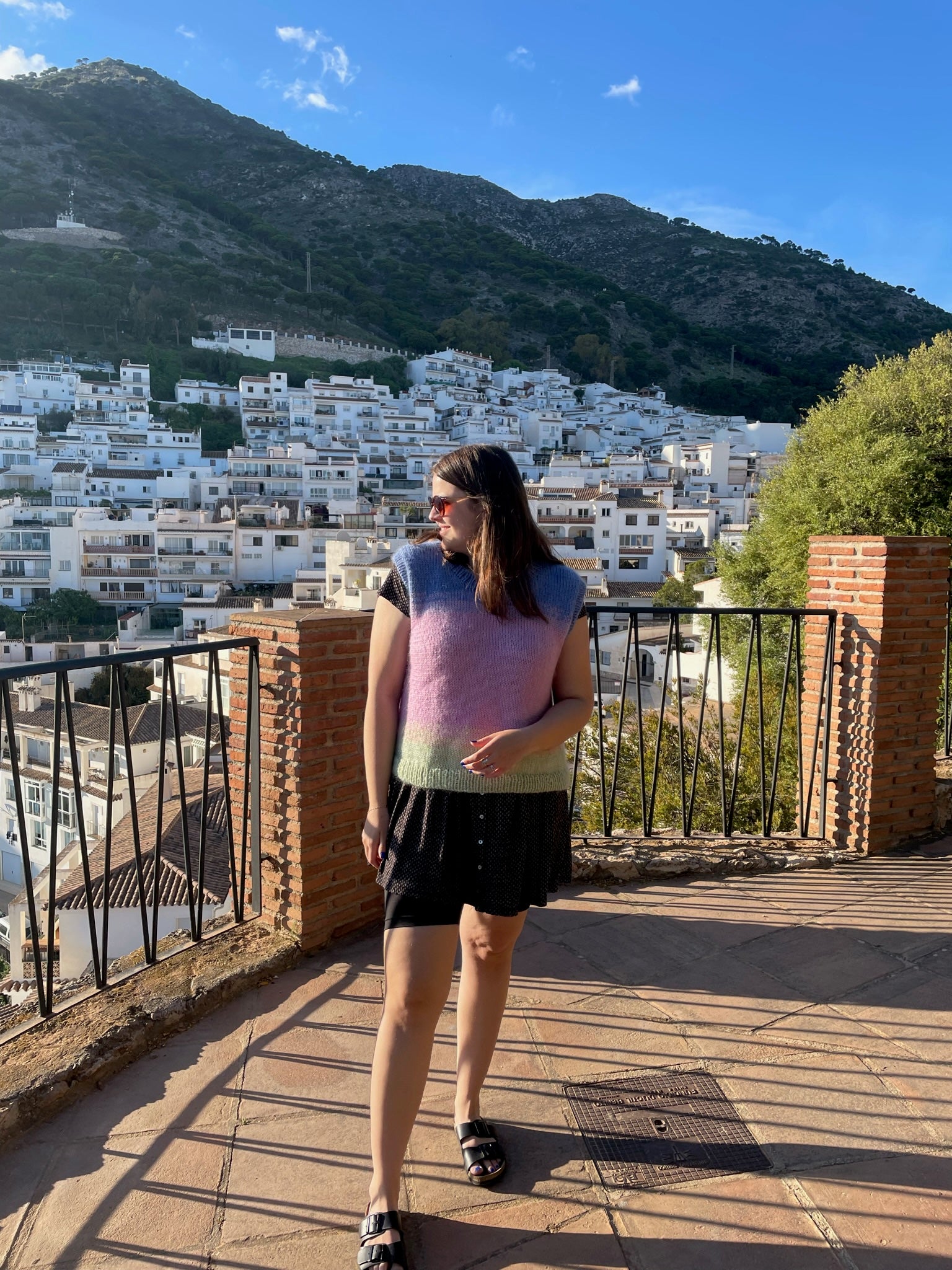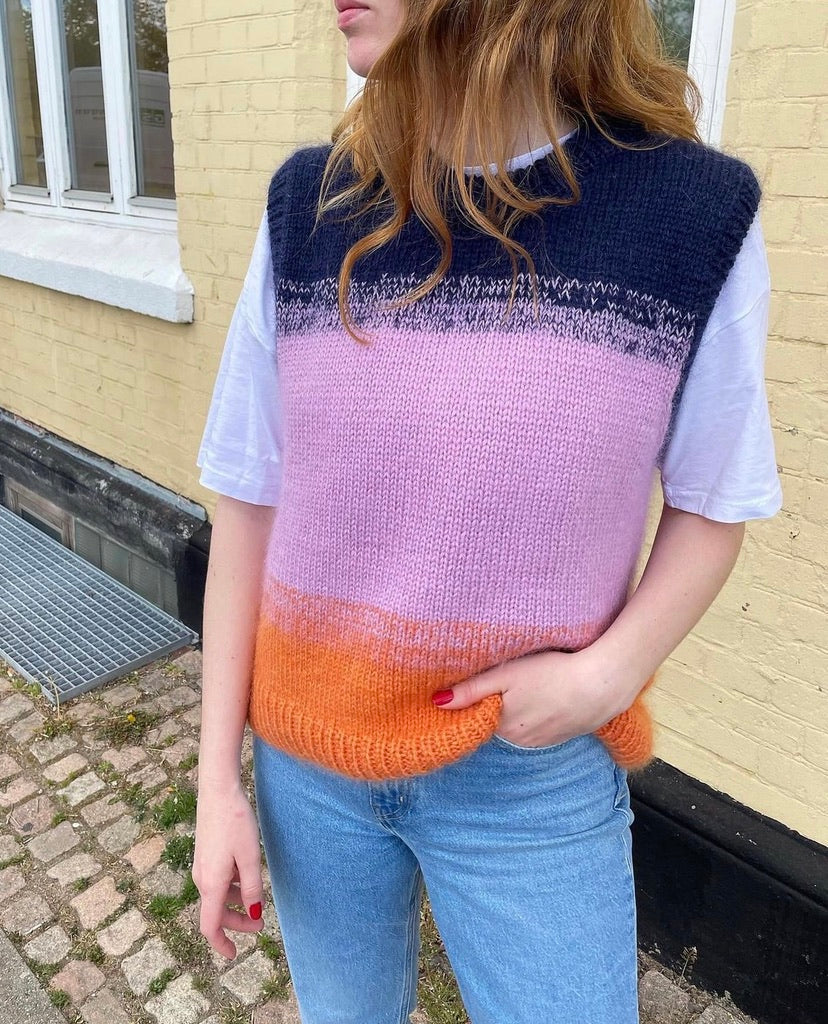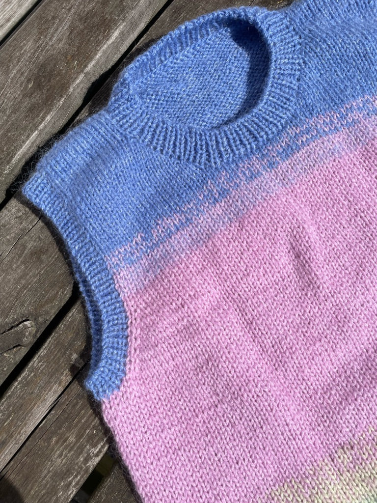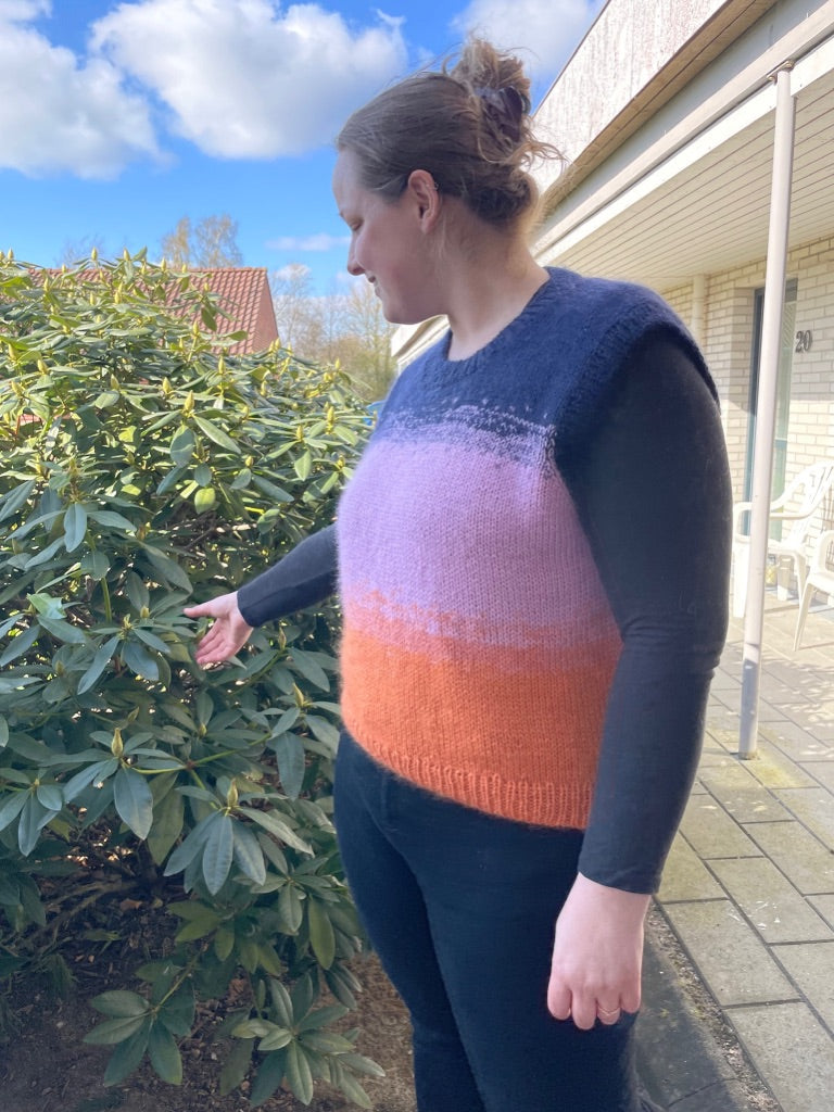 The Fading Rainbow Vest is a vest made in collaboration with Mette who is behind the Instagram profile Ungtblod. The vest is made with a 3-colour gradient, which creates a super cool look for a rather simple and beautiful vest. The vest is made from the top down and ribbed edges are added on the bottom as well as the arm holes at the end.